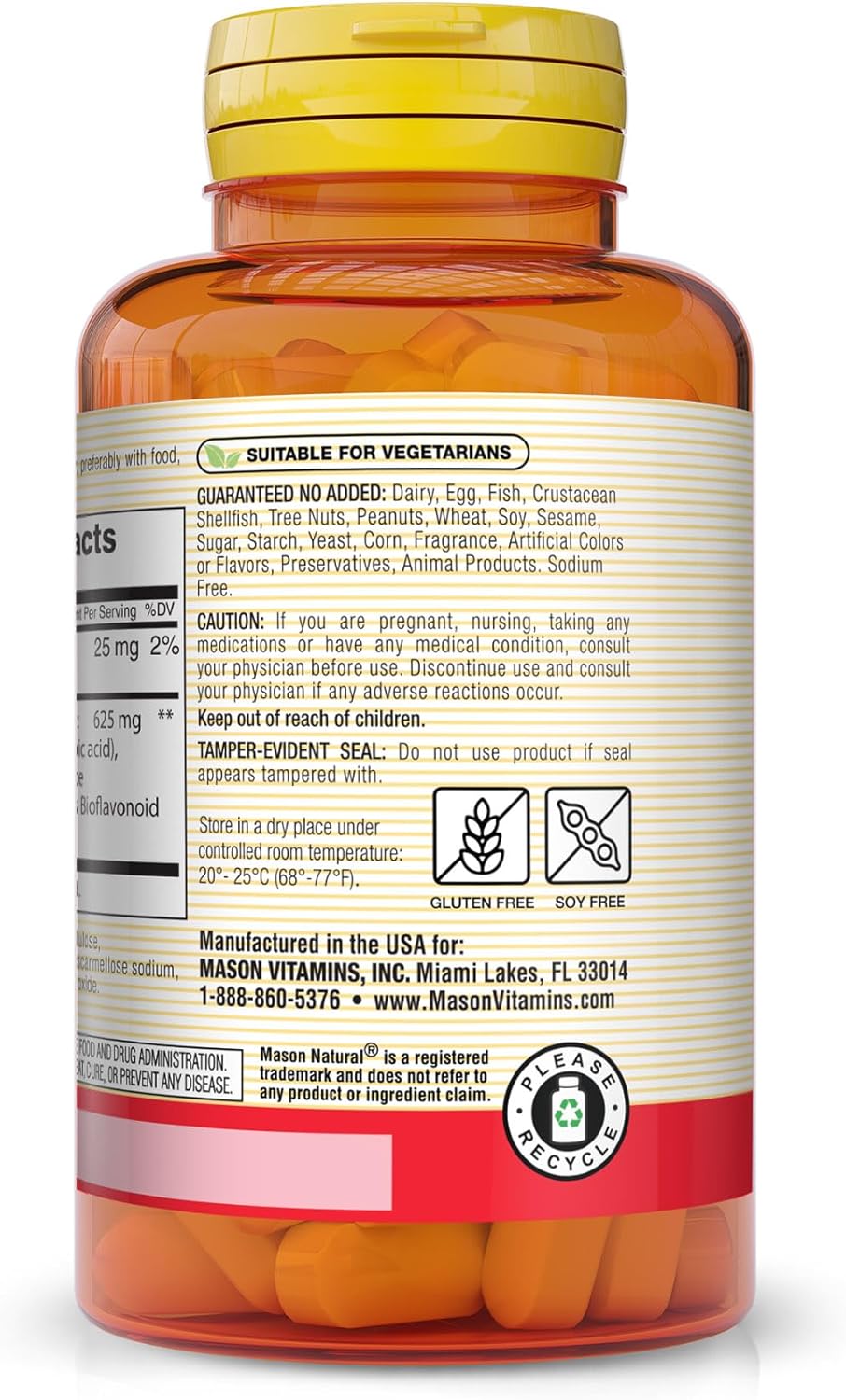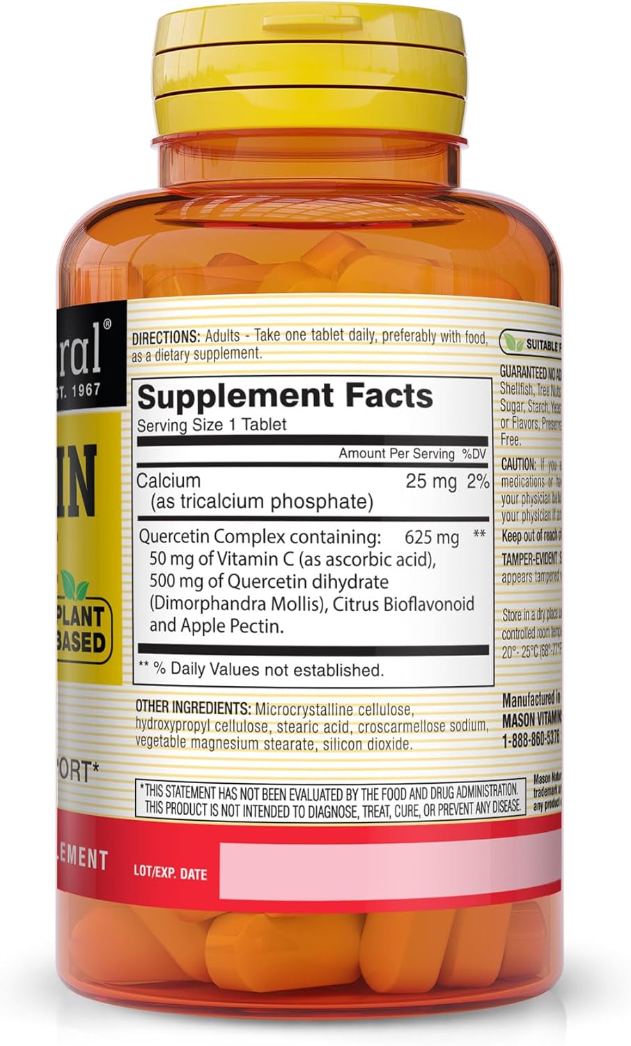 QUERCETIN COMPLEX: Our daily tablets are perfect for those looking to boost immunity, reduce inflammation and support optimal health and wellness10SPECIALTY FORMULA: Our health boosting tablets contain 25 mg of Calcium and 625 mg of Quercetin Complex, which includes Vitamin C, Quercetin dihydrate, Citrus Bioflavonoid and Apple Pectin10PLANT BASED: Minimally processed supplements offer several benefits over synthetic vitamins and minerals such as better bioavailability, which is how easily your body absorbs nutrients. Plant based supplements are typically are free from unnecessary fillers, inactive ingredients and other needless agents. This is better for your health and the environment10NO BAD STUFF: Soy Free. Guaranteed no added Dairy, Egg, Fish, Crustacean Shellfish, Tree Nuts, Peanuts, Wheat, Soy, Sesame, Sugar, Starch, Yeast, Corn, Fragrance, Artificial Colors or Flavors, Preservatives, Animal Products. Sodium Free10THE BEST VITAMINS FOR OVER 50 YEARS: For more than five decades, Mason Natural has produced quality vitamin supplements under cGMPs (current Good Manufacturing Practices) and adhering to US guidelines. All ingredients and finished goods are subjected to rigorous analytical testing, inspections and quality auditing1010