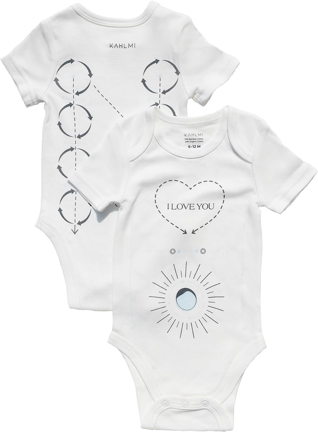 Learning baby massage is now a snap with this adorable printed onesie featuring easy-to-follow baby massage strokes and detailed instructions. Your Kahlmi baby massage onesie will help you soothe your baby through any stage. The perfect gift for any new parent!10Baby massage is the most effective method to nurture your baby naturally and relieve colds, teething pain, constipation and other digestive-related issues including colic, gas, constipation, and upset tummy10Created by a certified infant massage instructor, baby wellness expert, and Mom of 2 boys. It's perfect for baby shower gifts for mom and dad10It ensures a soft touch against delicate skin, making it safe for baby's sensitive needs. With its tailored neckline and stretchy material, dressing becomes a breeze, while snap-on buttons ensure hassle-free changing10Includes 1 KahlmI Massage Me Onesie along with an informative insert card that provides guidance on the benefits and instructions for each massage stroke