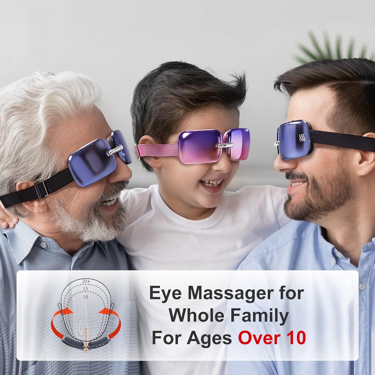 About this item ULTIMATE RELAXATION WITH UPGRADED DESIGN- Our all-new heated eye massager design is lightweight, compact, and easy to carry around. Soothe your tired eyes with vibrating, healing heat after a long day at work, playing video games, driving, or travel. 4 MASSAGE SETTINGS- With 12,000 vibrations per minute and 4 different modes (Vitality, Soothing, Exercise, Sleep), you can easily adjust the intensity during your eye massage to energize your mind or melt away stress. 3 SOOTHING HEATING LEVELS- Our eye mask massager warms with a copper heating plate that is both high quality and long-lasting, and heats up quickly, reaching 3 levels of heat with highly efficient power. Copper is much more dependable than the carbon fiber and graphene used on most other brands. SUPER QUIET & PORTABLE- Say goodbye to bulky eye massagers! This eye massager with heat weighs just 4 ounces and folds to a super compact 2.3” x3.5" that easily fits in the included storage bag for portability. Plus, it is whisper quiet at just 40 dB for discreet use. CONVENIENT RECHARGE –Fully recharge quickly with a Type C charger in just 2.5 hours! Our electric eye mask is tested on men and women ages 10 to 70 with excellent results and satisfaction, so you can use it no matter your age. Plus, it's a great gift idea! See more product details,ULTIMATE RELAXATION WITH UPGRADED DESIGN- Our all-new heated eye massager design is lightweight, compact, and easy to carry around. Soothe your tired eyes with vibrating, healing heat after a long day at work, playing video games, driving, or travel,4 MASSAGE SETTINGS- With 12,000 vibrations per minute and 4 different modes (Vitality, Soothing, Exercise, Sleep), you can easily adjust the intensity during your eye massage to energize your mind or melt away stress,3 SOOTHING HEATING LEVELS- Our eye mask massager warms with a copper heating plate that is both high quality and long-lasting, and heats up quickly, reaching 3 levels of heat with highly efficient power. Copper is much more dependable than the carbon fiber and graphene used on most other brands,SUPER QUIET & PORTABLE- Say goodbye to bulky eye massagers! This eye massager with heat weighs just 4 ounces and folds to a super compact 2.3” x3.5" that easily fits in the included storage bag for portability. Plus, it is whisper quiet at just 40 dB for discreet use,CONVENIENT RECHARGE –Fully recharge quickly with a Type C charger in just 2.5 hours! Our electric eye mask is tested on men and women ages 10 to 70 with excellent results and satisfaction, so you can use it no matter your age. Plus, it's a great gift idea!