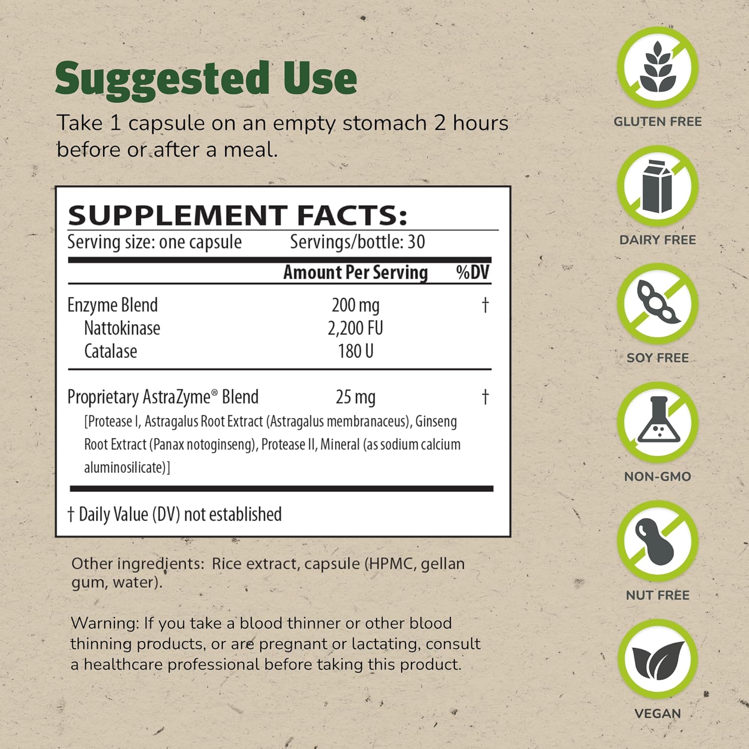 About this item CIRCULATORY SUPPORT - NattoStim offers targeted circulatory support. It is a blend of the systemic enzymes Nattokinase and Catalase in a proprietary mineral base which is designed to super-charge the effects of the enzyme actions. BENEFITS - Nattokinase helps maintain healthy circulation. Catalase removes hydrogen peroxide which results from enzyme action. This formula also supports overall immune health. ENHANCED ABSORPTION - NattoStim contains AstraZyme, which enhances enzyme actions by assisting protein digestion and absorbing peptides and amino acids faster and more completely. POTENCY THROUGH EXPIRATION - We enlist third-party labs to ensure the potency, purity, and quality of every lot through expiration. This product is also vegan, non-GMO, gluten free, dairy free, nut free, and soy free. See more product details,CIRCULATORY SUPPORT - NattoStim offers targeted circulatory support. It is a blend of the systemic enzymes Nattokinase and Catalase in a proprietary mineral base which is designed to super-charge the effects of the enzyme actions,BENEFITS - Nattokinase helps maintain healthy circulation. Catalase removes hydrogen peroxide which results from enzyme action. This formula also supports overall immune health,ENHANCED ABSORPTION - NattoStim contains AstraZyme, which enhances enzyme actions by assisting protein digestion and absorbing peptides and amino acids faster and more completely,POTENCY THROUGH EXPIRATION - We enlist third-party labs to ensure the potency, purity, and quality of every lot through expiration. This product is also vegan, non-GMO, gluten free, dairy free, nut free, and soy free