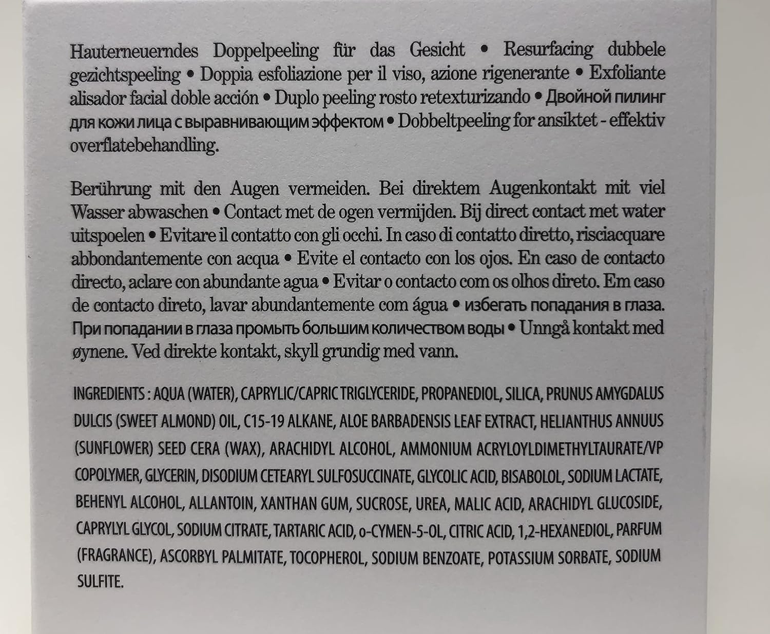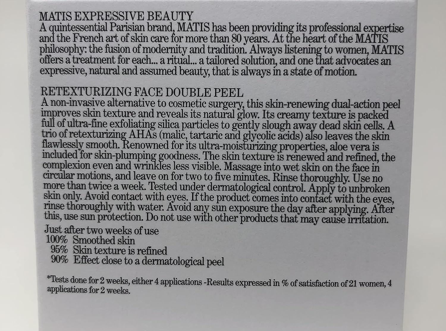 Its creamy texture is packed full of ultra-fine exfoliating silica particles to gently slough away dead skin cells. A trio of retexturizing AHAs (malic, tartaric and glycolic acids) also leaves the skin flawlessly smooth. Renowned for its ultra-moisturizing properties, aloe vera is included for skin-plumping goodness. The skin texture is renewed and refined, the complexion even and wrinkles less visible. Key Ingredients: AHA’s and aloe vera Usage: Massage into wet skin on the face in circular motions, and leave on for two to five minutes. Rinse thoroughly. Use no more than twice a week. Apply to unbroken skin only. Avoid contact with eyes. If the product comes into contact with the eyes, rinse thoroughly with water. Avoid any sun exposure the day after applying. After this, use Matis City-Mood + SPF for sun protection. Do not use with other products that may cause irritation. Content : 50 ml,Retexturizing double peel,Its creamy texture is packed full of ultra-fine exfoliating silica particles to gently slough away dead skin cells,AHA + Aloe vera,Massage into wet skin on the face in circular motions, and leave on for two to five minutes. Rinse thoroughly. Use no more than twice a week
