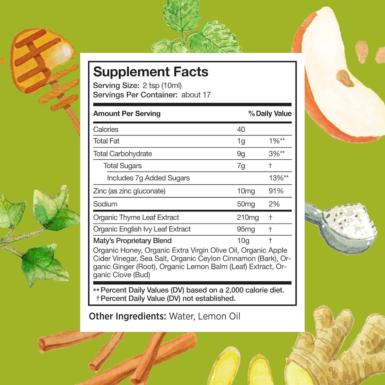 About this item NATURAL COUGH SYRUP: Each ingredient in Maty's Organic Children's Mucus Cough Syrup is thoughtfully chosen for its healing properties. We choose organic ginger, thyme and oregano to thin & loosen pesky mucus. USDA Certified Organic. IMMUNE BOOSTING INGREDIENTS: Each of Maty's cough syrups have ten immune boosting ingredients in every spoonful. When you have a cough or sore throat, our syrups soothe and coat your throat with organic honey and boost your immune system. KID FRIENDLY COUGH SYRUP: Get creative with how to take Maty's cough syrups. Since they're made with whole food ingredients, you can use them the same way you'd use honey or maple syrup. Put some in tea, oatmeal, smoothies or even on pancakes! RETHINK YOUR MEDICINE CABINET: Maty's whole food, alternative health products are made with real ingredients, so you get natural & pure products. Started by a mom who wanted natural remedies for her children, Maty's formulas provide safe, healthy relief. See more product details,NATURAL COUGH SYRUP: Each ingredient in Maty's Organic Children's Mucus Cough Syrup is thoughtfully chosen for its healing properties. We choose organic ginger, thyme and oregano to thin & loosen pesky mucus. USDA Certified Organic,IMMUNE BOOSTING INGREDIENTS: Each of Maty's cough syrups have ten immune boosting ingredients in every spoonful. When you have a cough or sore throat, our syrups soothe and coat your throat with organic honey and boost your immune system,KID FRIENDLY COUGH SYRUP: Get creative with how to take Maty's cough syrups. Since they're made with whole food ingredients, you can use them the same way you'd use honey or maple syrup. Put some in tea, oatmeal, smoothies or even on pancakes!,RETHINK YOUR MEDICINE CABINET: Maty's whole food, alternative health products are made with real ingredients, so you get natural & pure products. Started by a mom who wanted natural remedies for her children, Maty's formulas provide safe, healthy relief