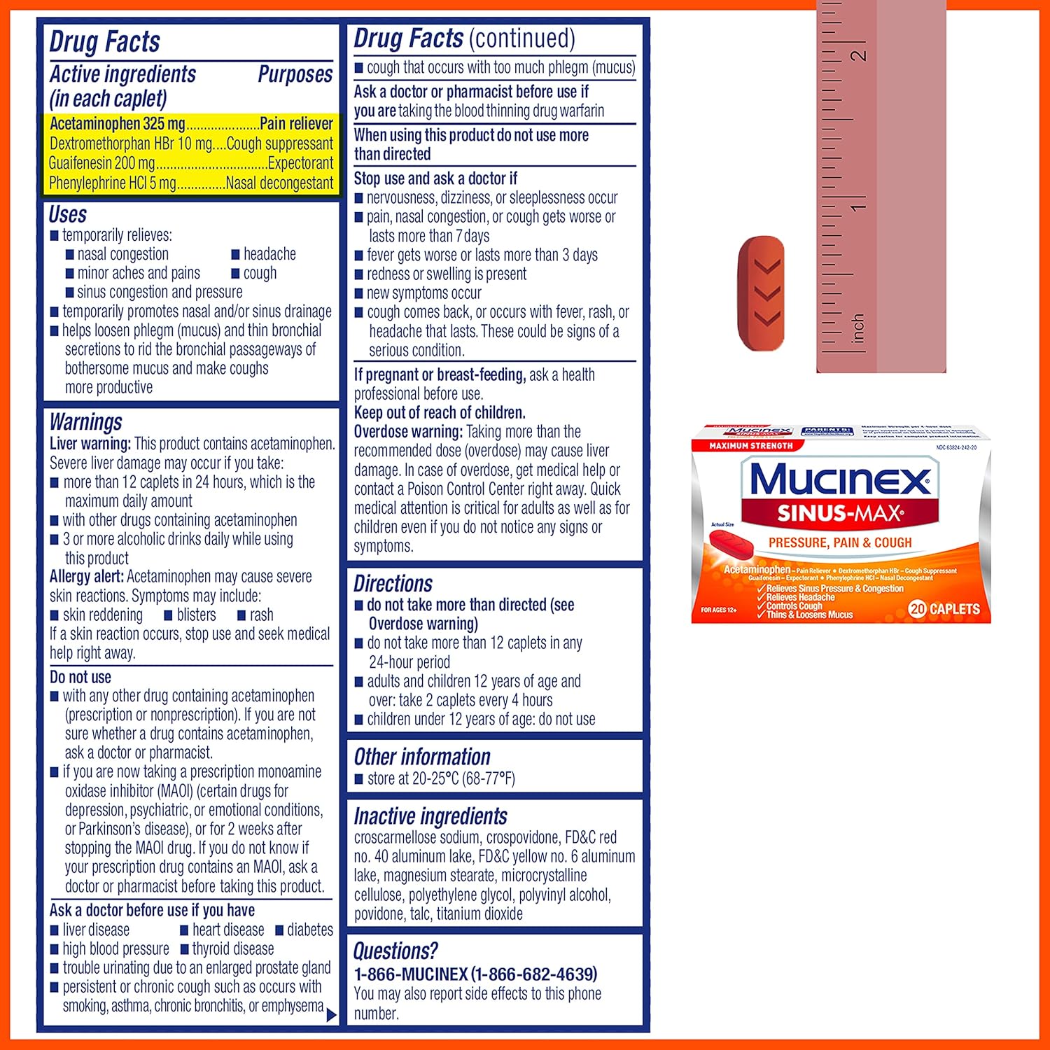 About this item MAXIMUM STRENGTH RELIEF: Maximum Strength Mucinex Sinus-Max Pressure, Pain & Cough helps relieve cough, stuffy nose, chest & nasal congestion, headache and minor aches and pains #1 TRUSTED COLD AND COUGH BRAND: #1 Cold and Cough brand doctors trust* PAIN RELIEVER: Contains Acetaminophen which relieves minor aches, pains and headache COUGH SUPPRESSANT: Contains Dextromethorphan HBr that helps relieve cough EXPECTORANT: Contains Guaifenesin that thins and loosens mucus; relieves chest congestion NASAL DECONGESTANT: Contains Phenylephrine HCl that provides relief for nasal congestion, sinus congestion and pressure USAGE: Use as directed; For ages 12+ years › See more product details,MAXIMUM STRENGTH RELIEF: Maximum Strength Mucinex Sinus-Max Pressure, Pain & Cough helps relieve cough, stuffy nose, chest & nasal congestion, headache and minor aches and pains,#1 TRUSTED COLD AND COUGH BRAND: #1 Cold and Cough brand doctors trust,PAIN RELIEVER: Contains Acetaminophen which relieves minor aches, pains and headache,COUGH SUPPRESSANT: Contains Dextromethorphan HBr that helps relieve cough,EXPECTORANT: Contains Guaifenesin that thins and loosens mucus; relieves chest congestion,NASAL DECONGESTANT: Contains Phenylephrine HCl that provides relief for nasal congestion, sinus congestion and pressure,USAGE: Use as directed; For ages 12+ years