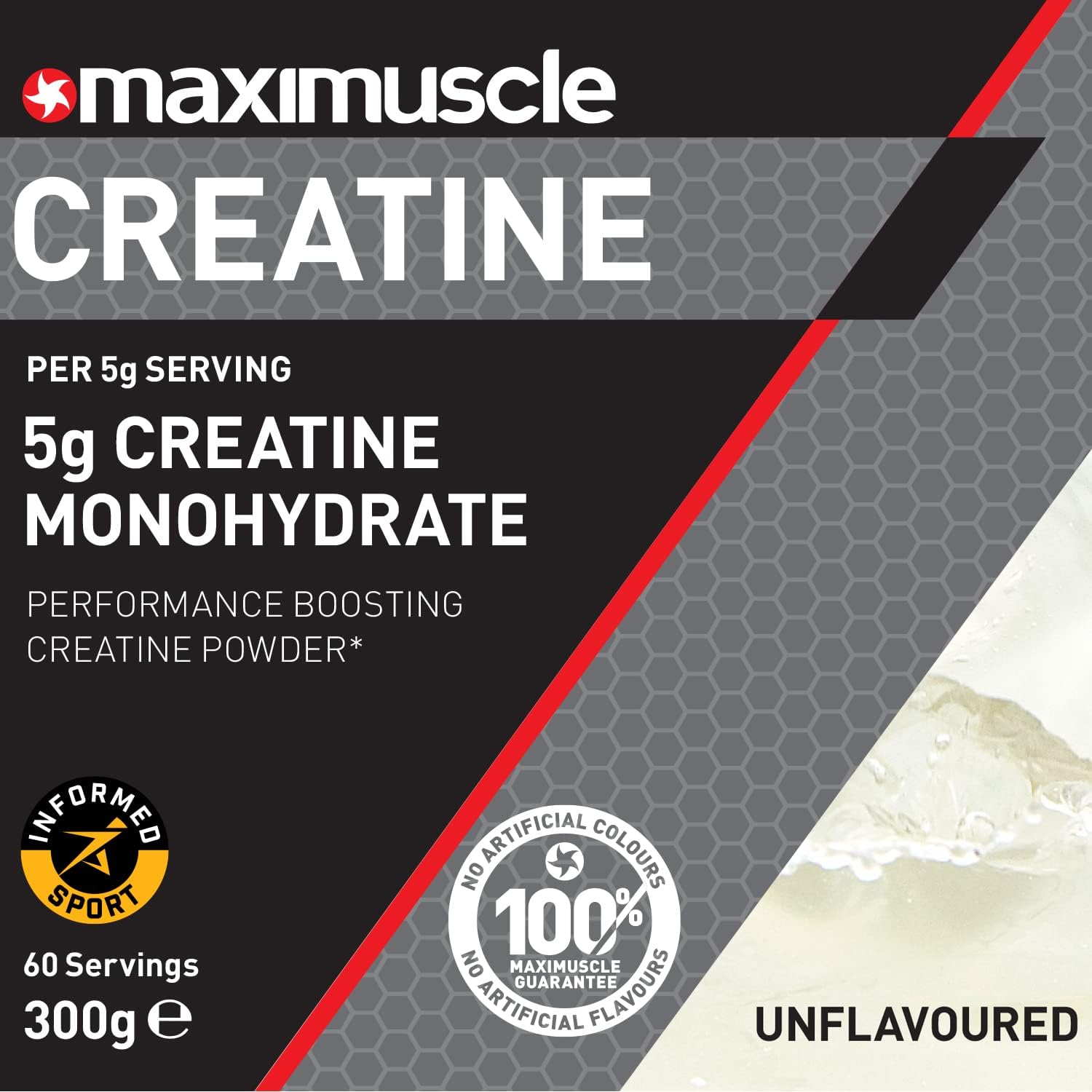 DESCRIPTION : Product Description Maximuscle Creatine| Performance Boosting Creatine Monohydrate Powder | Unflavoured, 300g - 60 Servings Maximuscle Creatine helps your muscles produce energy during heavy lifting or high-intensity exercise. Perfect for gaining muscle, enhancing strength and improving exercise performance. It is unflavoured and suitable for vegetarians. Its what is inside that counts You can improve your strength, increase your physical performance and help the muscles recover more quickly during exercise with our high-quality Creatine Monohydrate that contains 5g per serving. Our premium formula is free from artificial colours and flavours. For one serving, mix 1 level scoop (5g) with 200-250ml of water or add one serving to your protein shake or fruit juice. For the best results, consume creatine daily across 1-4 servings. Rooted in transparency, the entire Maximuscle range is screened for banned substances and accredited on the Informed-Sport programme providing you with safe and reliable sports supplements. About Maximuscle A brand built on integrity, dedication and individuality, since 1995, Maximuscle has been making high-quality sports nutrition products from carefully selected ingredients that work. Dedicated to helping you define, build and exceed. UK Address: c/o Boughey Distribution Limited, Nantwich Rd, Wardle, Nantwich, CW5 6RS Ingredients CREATINE MONOHYDRATE P.when('A').execute(function(A) { A.on('a:expander:toggle_description:toggle:collapse', function(data) { window.scroll(0, data.expander.$expander[0].offsetTop-100); }); }); Directions MIX 1 LEVEL SCOOP (5g) WITH 200-250ml OF WATER IN A MAXIMUSCLE SHAKER. ALTERNATIVELY, ? ADD 1 SERVING TO YOUR PROTEIN SHAKE OR FRUIT JUICE. CONSUME UP TO 1-4 SERVINGS PER DAY. ?DO NOT EXCEED DAILY DOSAGE. Safety Warning FOOD SUPPLEMENTS SHOULD NOT BE USED AS A SUBSTITUTE FOR A VARIED BALANCED DIET AND A HEALTHY LIFESTYLE. DO NOT EXCEED THE RECOMMENDED DAILY INTAKE. KEEP OUT OF THE REACH AND SIGHT OF CHILDREN. Manufacturer Contact Information MAXIMUSCLE CUSTOMER RELATIONS, HNC (UK) LTD. PO BOX 683, SALFORD, M5 0NW See more