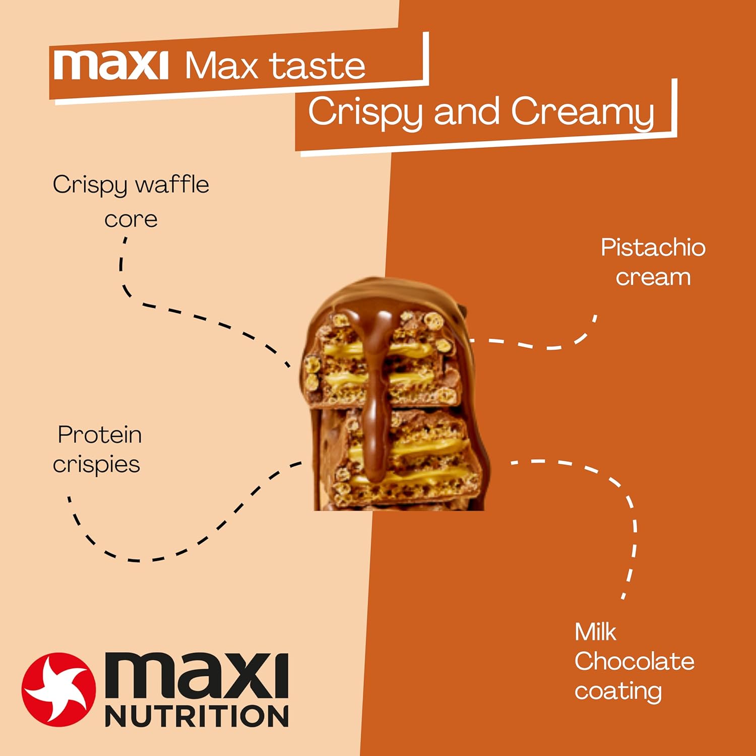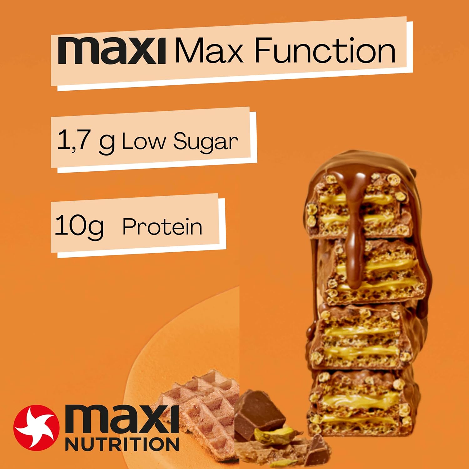 Maxinutrition Pistachio Spread Protein Waffle Bar 12 X 39G Bar, 10G Protein, 199 Kcal, 13G Carbs Per Bar