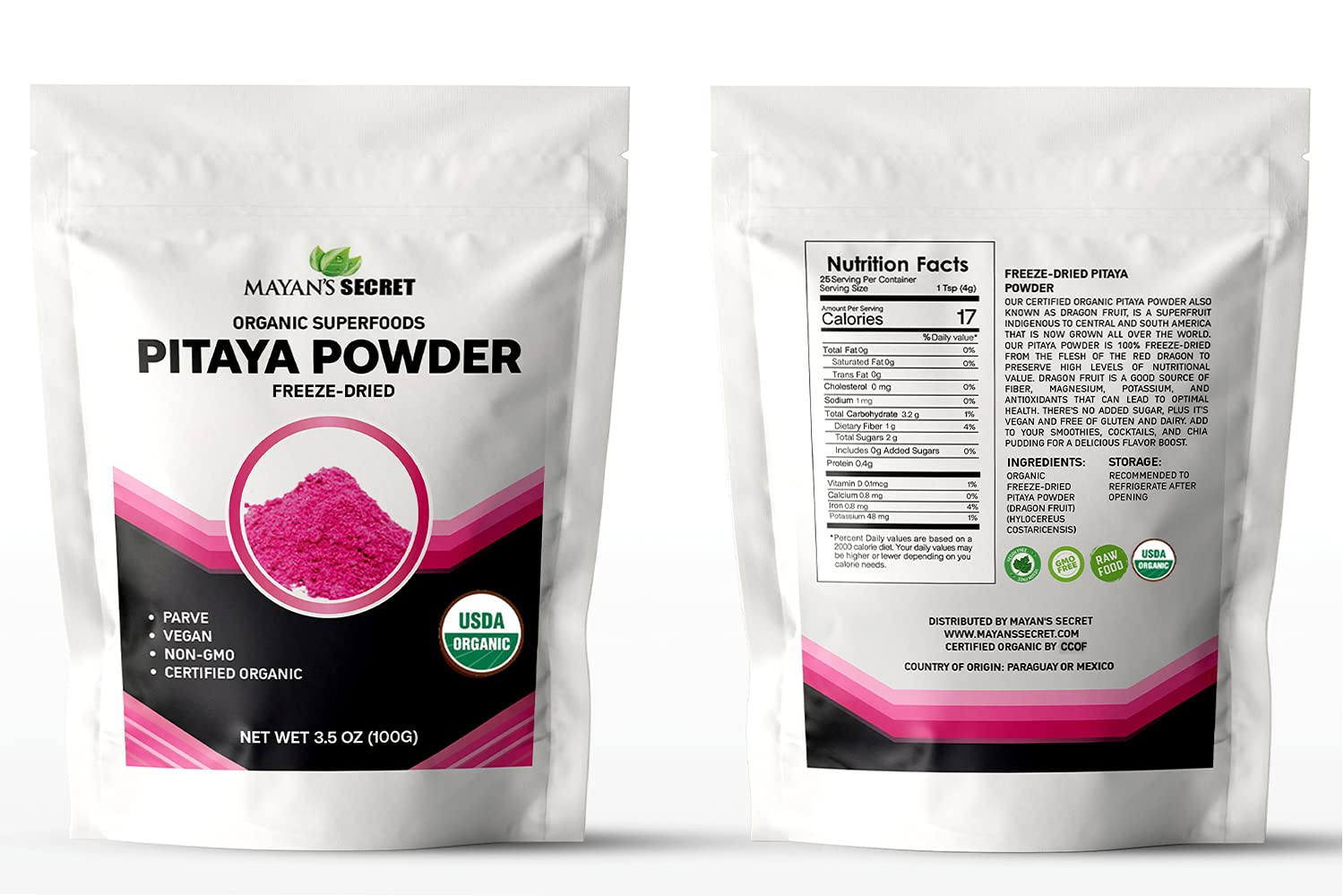 About this item Mayan’s Secret Certified Organic Freeze-Dried Pitaya Powder (Dragon Fruit), 3.5 Oz Pouch VITAMIN RICH AND NUTRIENT DENSE: Full of fiber, potassium, and magnesium as well as vitamin C, adding Dragon Fruit to your diet has been shown to help support digestion, strengthens the immune system and increase energy. Tired of your typical DULL & BORING looking breakfast/snack/smoothie We’ve got a solution for you! ADD EXOTIC, VIBRANT, MAGENTA COLOR & APPEAL to all your favorite meals! Our ORGANIC RED DRAGON FRUIT POWDER (PINK PITAYA or PITAHAYA POWDER) is made from 100% natural fruit, and can be enjoyed in smoothies, oatmeal, chia seed pudding, desserts, baked goods, and more! 100% Natural, Plant-Based, Gluten-Free, Vegan, Raw, Non-GMO, no added sugar, no “other ingredients” or additives 100% satisfaction guarantee! 100% Money-Back Satisfaction Guarantee - We stand behind our products and offer a 30-day money back guarantee, backed by an outstanding customer service team. See more product details,Mayan’s Secret Certified Organic Freeze-Dried Pitaya Powder (Dragon Fruit), 3.5 Oz Pouch,VITAMIN RICH AND NUTRIENT DENSE: Full of fiber, potassium, and magnesium as well as vitamin C, adding Dragon Fruit to your diet has been shown to help support digestion, strengthens the immune system and increase energy,Tired of your typical DULL & BORING looking breakfast/snack/smoothie We’ve got a solution for you! ADD EXOTIC, VIBRANT, MAGENTA COLOR & APPEAL to all your favorite meals! Our ORGANIC RED DRAGON FRUIT POWDER (PINK PITAYA or PITAHAYA POWDER) is made from 100% natural fruit, and can be enjoyed in smoothies, oatmeal, chia seed pudding, desserts, baked goods, and more!,100% Natural, Plant-Based, Gluten-Free, Vegan, Raw, Non-GMO, no added sugar, no “other ingredients” or additives 100% satisfaction guarantee!,100% Money-Back Satisfaction Guarantee - We stand behind our products and offer a 30-day money back guarantee, backed by an outstanding customer service team