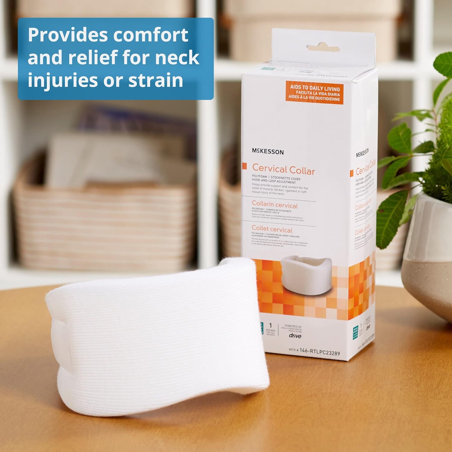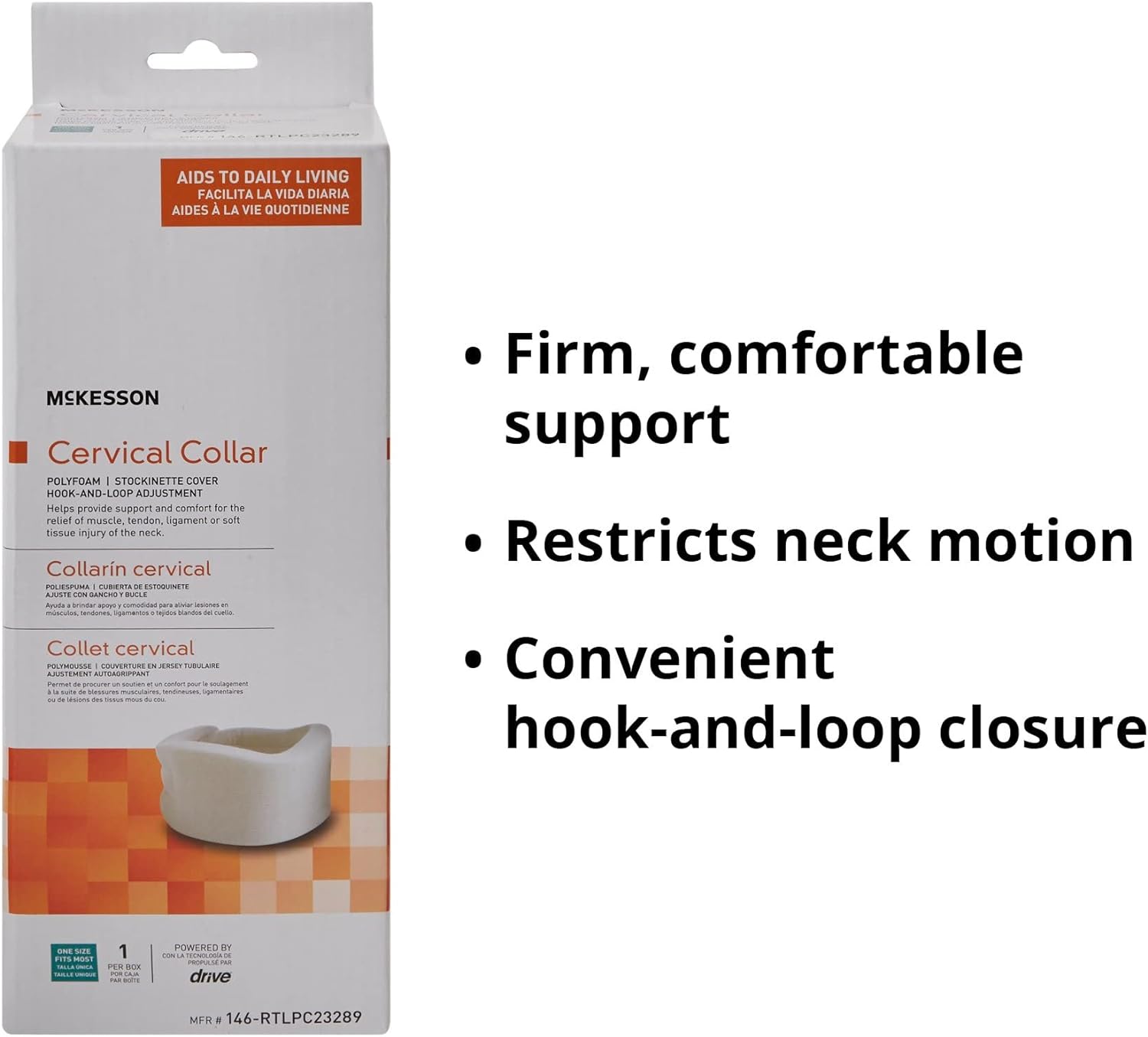 This one-piece cervical collar helps provide firm, comfortable support for the relief of muscle, tendon, ligament, or soft issue injuries of the neckSoft, porous, off-white stockinette made of 100% polyester rib fabric with a polyfoam collar for comfort; restricts neck motion, helping to relieve neck discomfort or strainFeatures 7/8 inch thick polyurethane foam construction for effective support; convenient hook-and-loop closure allows the unit to be adjusted for a proper fitReusable design can be cleaned by handwashing in cold soapy water and letting air dryOne size fits most adults; circumference is 19 to 22 inches; 22 inches long and 3 3/4 inches high