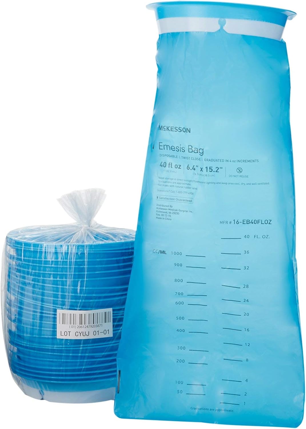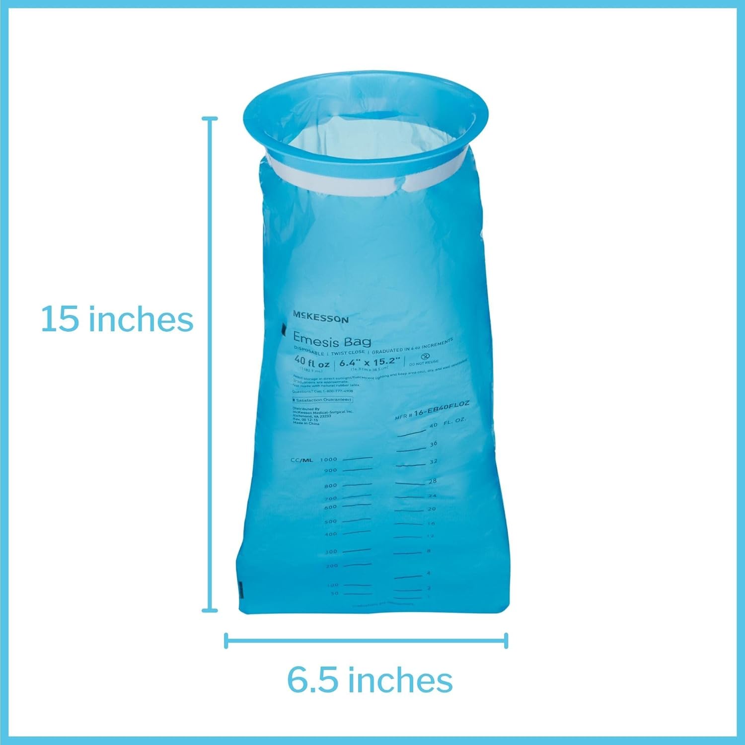 About this item McKesson's blue emesis bags are designed as an effective waste collection method; caregivers can easily twist the bags closed and hook them into the notched rings to help reduce odors The twist-and-hook enclosure also provides a way to help minimize exposure to bodily fluids or emesis and helps enable a quick disposal Our emesis bags are graduated in 4 fl oz increments to allow for monitoring of content volume Medical staff or caregivers can hang the bag near patients to avoid any spills Each bag holds 40 fl oz and measures 6.5 inches x 15 inches; non-sterile, single use only › See more product details,McKesson's blue emesis bags are designed as an effective waste collection method; caregivers can easily twist the bags closed and hook them into the notched rings to help reduce odors,The twist-and-hook enclosure also provides a way to help minimize exposure to bodily fluids or emesis and helps enable a quick disposal,Our emesis bags are graduated in 4 fl oz increments to allow for monitoring of content volume,Medical staff or caregivers can hang the bag near patients to avoid any spills,Each bag holds 40 fl oz and measures 6.5 inches x 15 inches; non-sterile, single use only
