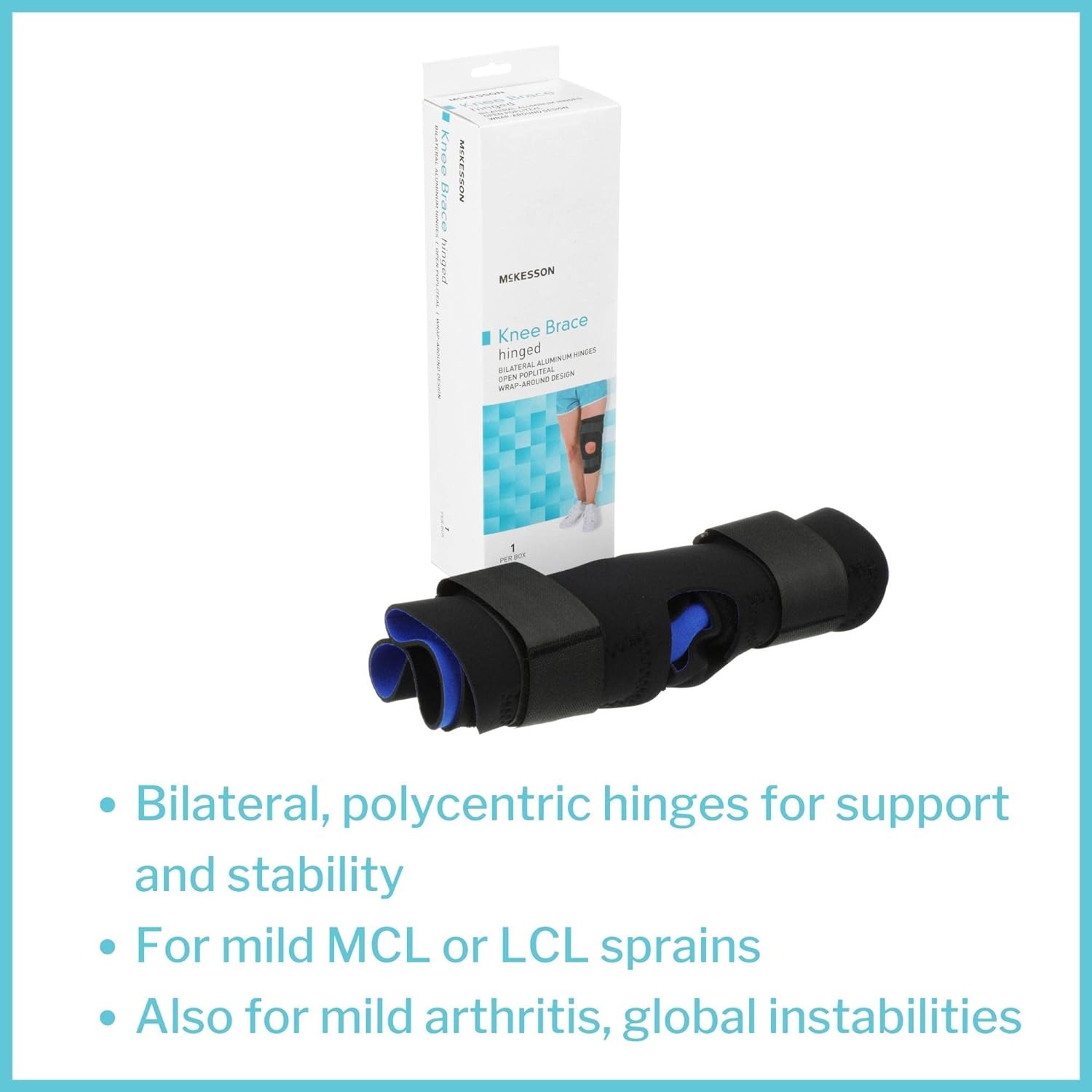 Protect the knee following injury or surgery with this McKesson hinged knee braceDesigned for mild MCL and/or LCL sprains, mild arthritis, post arthroscopic meniscectomy, and mild global instabilitiesHinges on this knee brace give it additional support and stability; adjustable straps with D-rings offer a secure fitWith an elastic wrap-around design and neoprene padding, users experience a firm, satisfying fit while also receiving compression for swellingSize 2XL: Has a circumference of 25.5 to 28 inches
