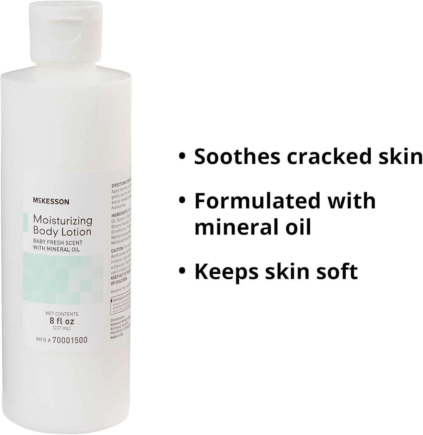 About this item Soothes and moisturizes: McKesson's scented moisturizing skin cream conditions the hands, body and legs to temporarily protect and relieve chapped or cracked skin and provide long-lasting hydration Safe for sensitive skin: Ideal for fragile and delicate skin, this cream provides relief for adults and children and has a pleasant baby-soft fragrance Protects and smooths: Soothes, smooths and protects skin for long-lasting comfort Quality ingredients: Formulated with high-quality ingredients, the lotion's secret for keeping skin so soft and moisturized is the addition of mineral oil Directions for use: Apply liberally as needed and massage gently into the skin; use after bathing and as needed to keep skin moisturized See more product details,Soothes and moisturizes: McKesson's scented moisturizing skin cream conditions the hands, body and legs to temporarily protect and relieve chapped or cracked skin and provide long-lasting hydration,Safe for sensitive skin: Ideal for fragile and delicate skin, this cream provides relief for adults and children and has a pleasant baby-soft fragrance,Protects and smooths: Soothes, smooths and protects skin for long-lasting comfort,Quality ingredients: Formulated with high-quality ingredients, the lotion's secret for keeping skin so soft and moisturized is the addition of mineral oil,Directions for use: Apply liberally as needed and massage gently into the skin; use after bathing and as needed to keep skin moisturized