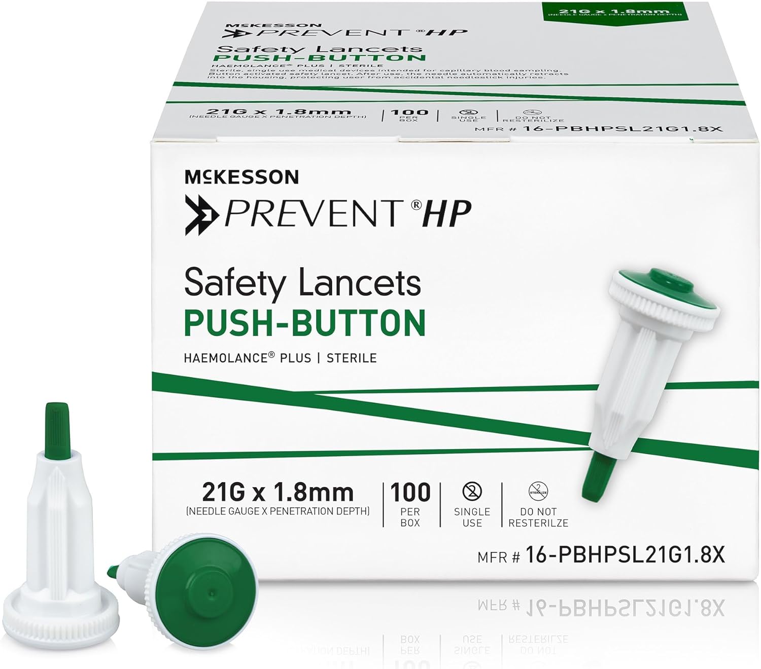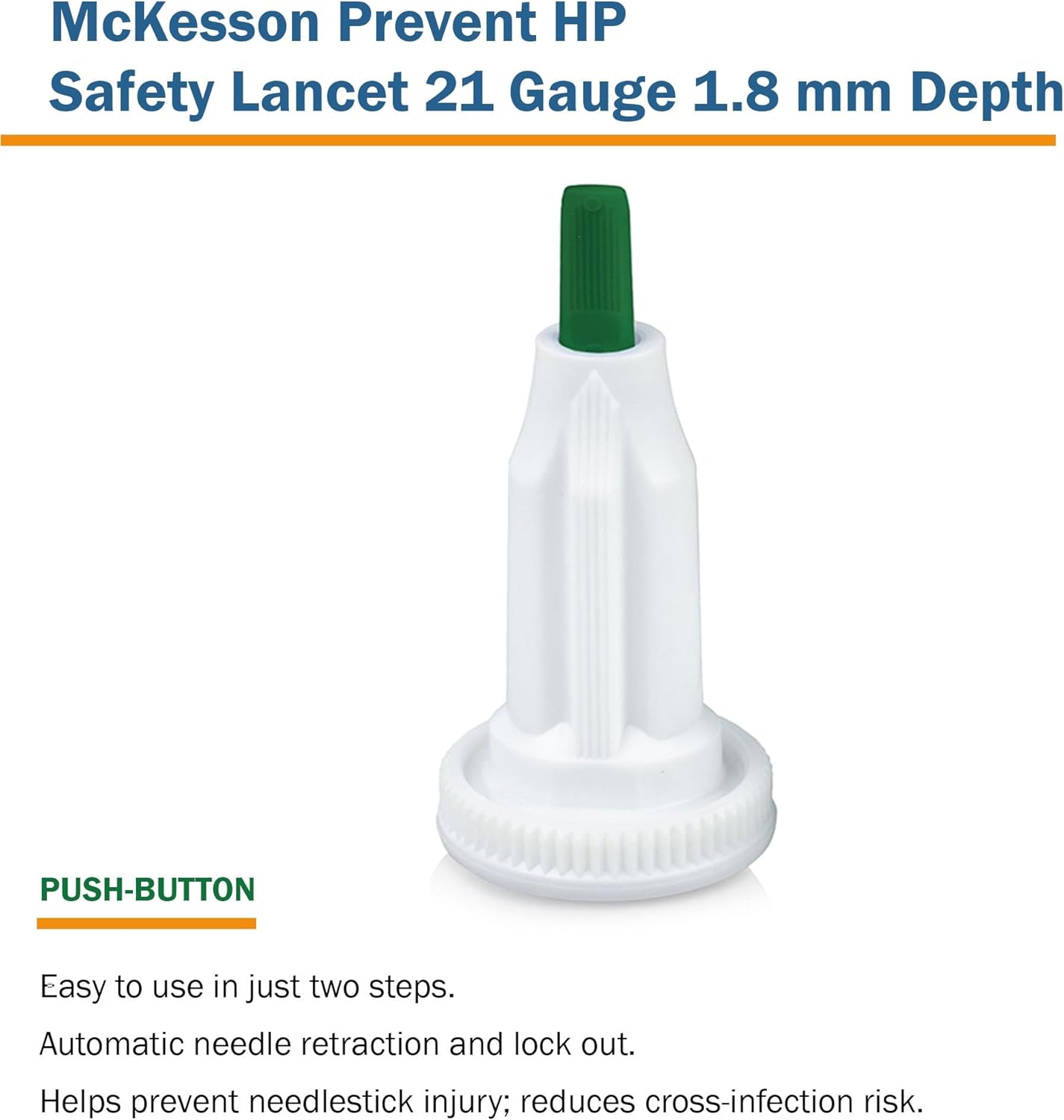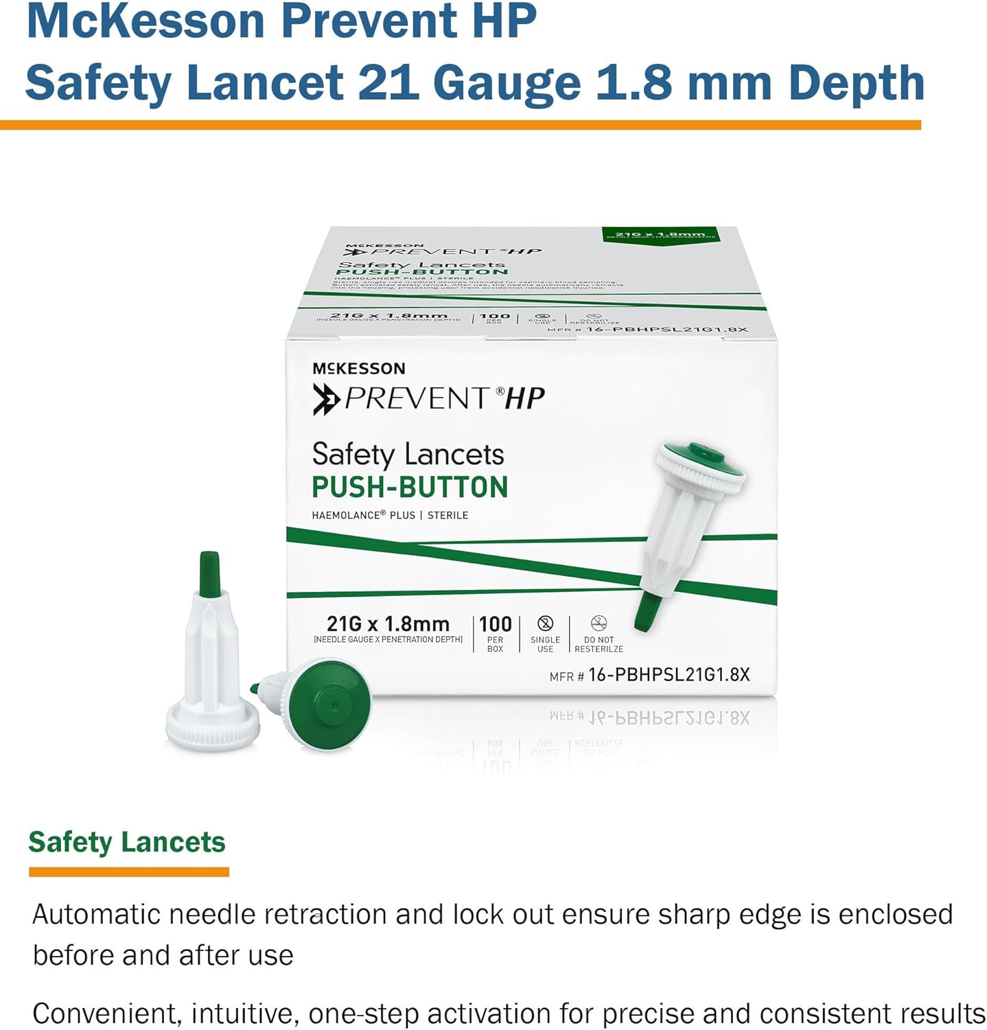 Mckesson Prevent Hp Safety Lancet, Auto Retracting With Push Button Activation, 21 Gauge, 1.8 Mm Depth, Sterile, Green, 100 Count, 1 Pack