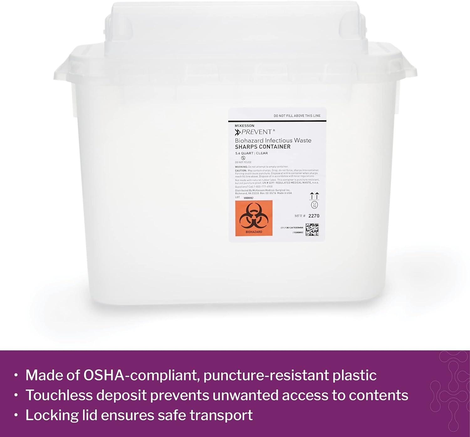 Hard plastic sharps containers ensure there are no punctures or leaks; containers are universally fail-proof; each container is 5.4 quartsLids of these infectious containers lock shut so contents remain inside safely until disposalBoth the lid and container are translucent; users can see inside without having to risk unlocking the lid and reopening the containerLong, tall shape allows plenty of space inside; conserves storage space; works with McKesson 2240 wall brackets for wall mountingTranslucent sharps container dimensions: 11 H X 12 W X 4 3/4 D Inches