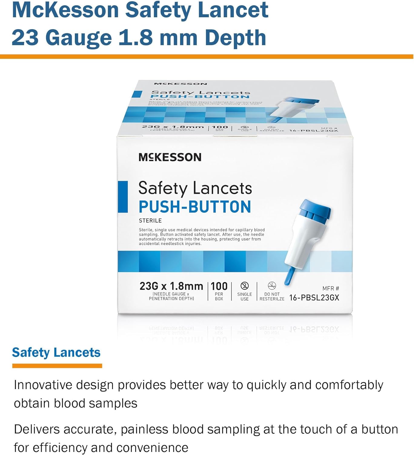 Efficient and Convenient Blood Sampling: McKesson Push-Button Safety Lancets provide a better way to obtain blood samples quickly and comfortably, delivering accurate results with the touch of a button for enhanced efficiency and convenience10Painless and Gentle Sampling: The gamma-sterilized 23-gauge needle of these lancets is fully covered and protected with a sterility tab, ensuring reliability and minimizing pain. The electro-polished, silicone-coated needle with high puncture speed facilitates healing and enables gentle fingertip and heel sampling10Optimal Safety and Reliability: With a fixed depth of 1.8 mm for optimized needle exposure, these safety lancets guarantee adequate blood flow. The enhanced safety features include a sterility tab and a self-destructing activation mechanism, providing peace of mind during blood sampling10Easy-to-Use and Intuitive Design: Our retractable lancets feature an intuitive, 2-step operation that requires no lancet loading, making them easy to handle. The low firing force ensures a comfortable experience for users10Color-Coded for Convenience: The yellow color-coded design allows for easy gauge identification, making it simple to choose the right lancet for your needs. Plus, these lancets are disposable for convenient single-use, ensuring hygiene and eliminating the need for reusing lancets1010