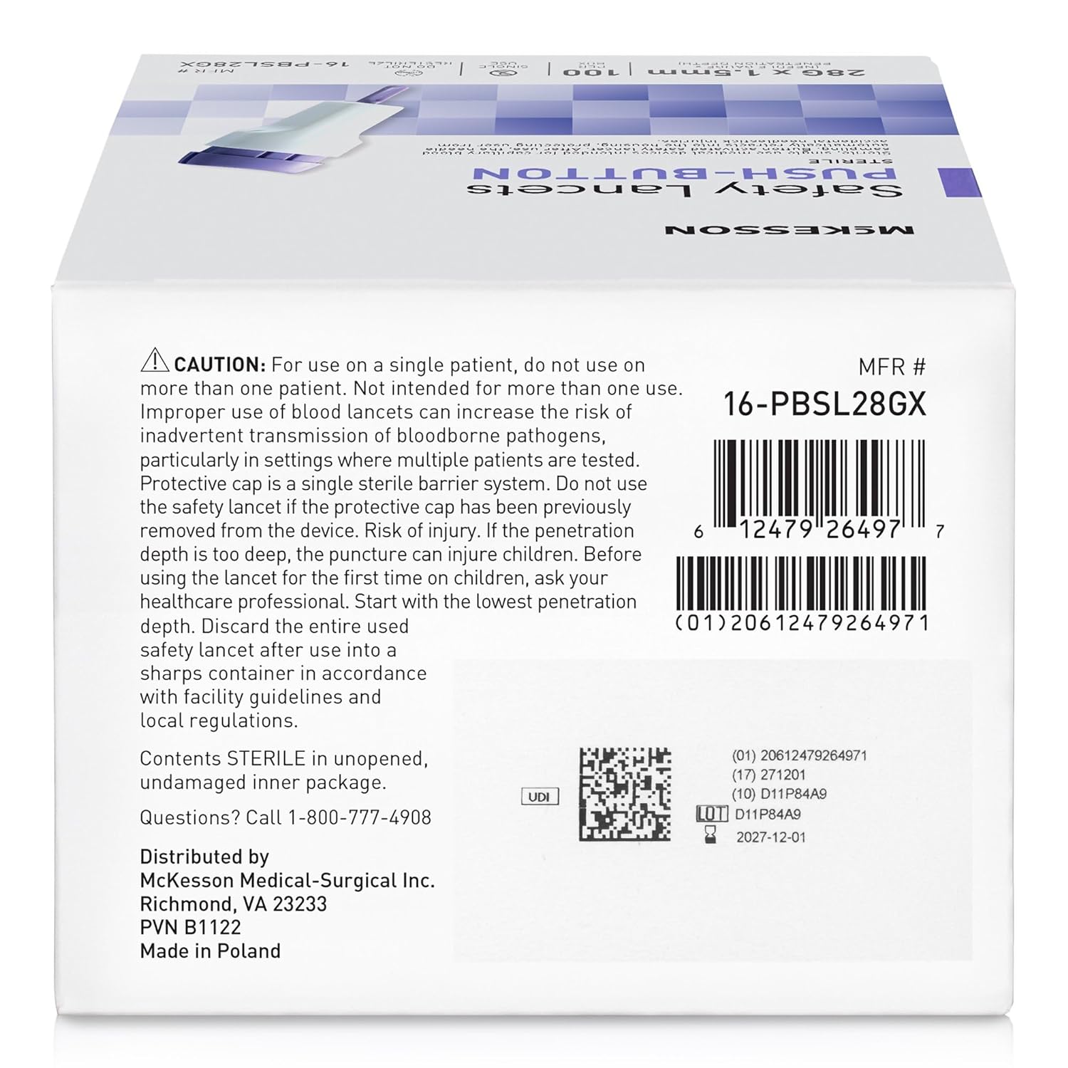 Efficient and Convenient Blood Sampling: McKesson Push-Button Safety Lancets provide a better way to obtain blood samples quickly and comfortably, delivering accurate results with the touch of a button for enhanced efficiency and convenience10Painless and Gentle Sampling: The gamma-sterilized 28-gauge needle of these lancets is fully covered and protected with a sterility tab, ensuring reliability and minimizing pain. The electro-polished, silicone-coated needle with high puncture speed facilitates healing and enables gentle fingertip and heel sampling10Optimal Safety and Reliability: With a fixed depth of 1.5 mm for optimized needle exposure, these safety lancets guarantee adequate blood flow. The enhanced safety features include a sterility tab and a self-destructing activation mechanism, providing peace of mind during blood sampling10Easy-to-Use and Intuitive Design: Our retractable lancets feature an intuitive, 2-step operation that requires no lancet loading, making them easy to handle. The low firing force ensures a comfortable experience for users10Color-Coded for Convenience: The yellow color-coded design allows for easy gauge identification, making it simple to choose the right lancet for your needs. Plus, these lancets are disposable for convenient single-use, ensuring hygiene and eliminating the need for reusing lancets1010