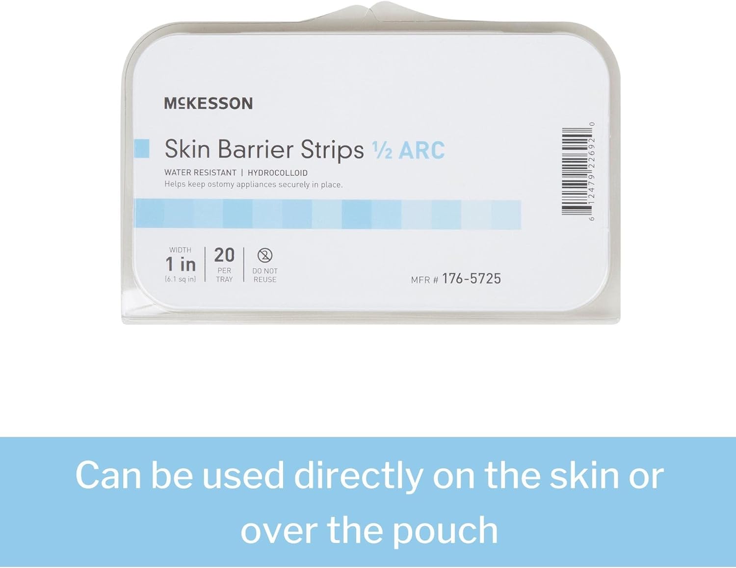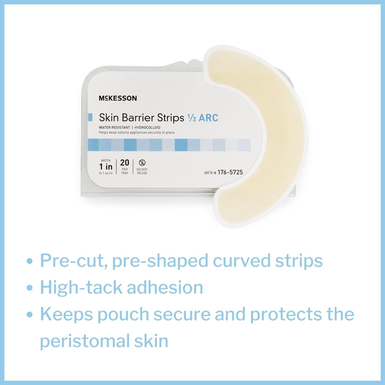 Skin barrier strips keep the ostomy pouch secure and protect peri-stomal skin; safe for application directly on the skin, beneath the pouching system or placed over the pouch to keep secureWater-resistant surface with gentle, highly absorbent hydrocolloid adhesive soaks up exudate and allows for use when showering and bathingEach pre-cut, pre-shaped strip has high-tack adhesion for easy application and is latex-free, making them safe for patients with tape allergies and other sensitivitiesCurved, 1-inch wide hydrocolloid skin barrier strips have an 0.5-arc shape to picture-frame the flangeThin edge of the ostomy barrier strips helps to keep them smooth against skin without rolling up as the body moves