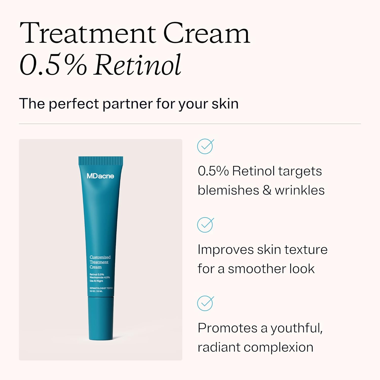 About this item MDacne retinol cream: this unique retinol cream combines the magic of high-strength 0.5% retinol and 4% niacinamide to help reduce blemishes, target fine wrinkles and uneven skin tone and help improve the skin's texture for more youthful-looking skin. 0.5 fl oz. Ingredients that work: pure Retinol works to help unclog pores and prevent acne blemishes and fine wrinkles without over-drying the skin. Niacinamide, or vitamin b3, is a potent anti-inflammatory ingredient that supports skin hydration and improved skin texture and helps fade post-acne dark spots. Boosters: tea tree oil is known to work efficiently against acne. Aloe vera, chamomile, and calendula officinalis extracts hydrate skin, soothe irritation, and reduce redness. Sunflower extract exhibits anti-glycation properties, and licorice extract helps prevent and fade brown spots. All-natural & good-for-you: MDacne retinol cream is dermatologist designed and approved, and made in the USA. Free from parabens, sulfates, silicone, and gluten. Non-toxic, vegan, and cruelty-free. A different approach: we founded MDacne to create a more effective and affordable way to treat acne. We're on a mission to help clear your skin in an easier, faster, and more pleasant way than anything you've tried before. See more product details,MDacne retinol cream: this unique retinol cream combines the magic of high-strength 0.5% retinol and 4% niacinamide to help reduce blemishes, target fine wrinkles and uneven skin tone and help improve the skin's texture for more youthful-looking skin. 0.5 fl oz,Ingredients that work: pure Retinol works to help unclog pores and prevent acne blemishes and fine wrinkles without over-drying the skin. Niacinamide, or vitamin b3, is a potent anti-inflammatory ingredient that supports skin hydration and improved skin texture and helps fade post-acne dark spots,Boosters: tea tree oil is known to work efficiently against acne. Aloe vera, chamomile, and calendula officinalis extracts hydrate skin, soothe irritation, and reduce redness. Sunflower extract exhibits anti-glycation properties, and licorice extract helps prevent and fade brown spots,All-natural & good-for-you: MDacne retinol cream is dermatologist designed and approved, and made in the USA. Free from parabens, sulfates, silicone, and gluten. Non-toxic, vegan, and cruelty-free,A different approach: we founded MDacne to create a more effective and affordable way to treat acne. We're on a mission to help clear your skin in an easier, faster, and more pleasant way than anything you've tried before