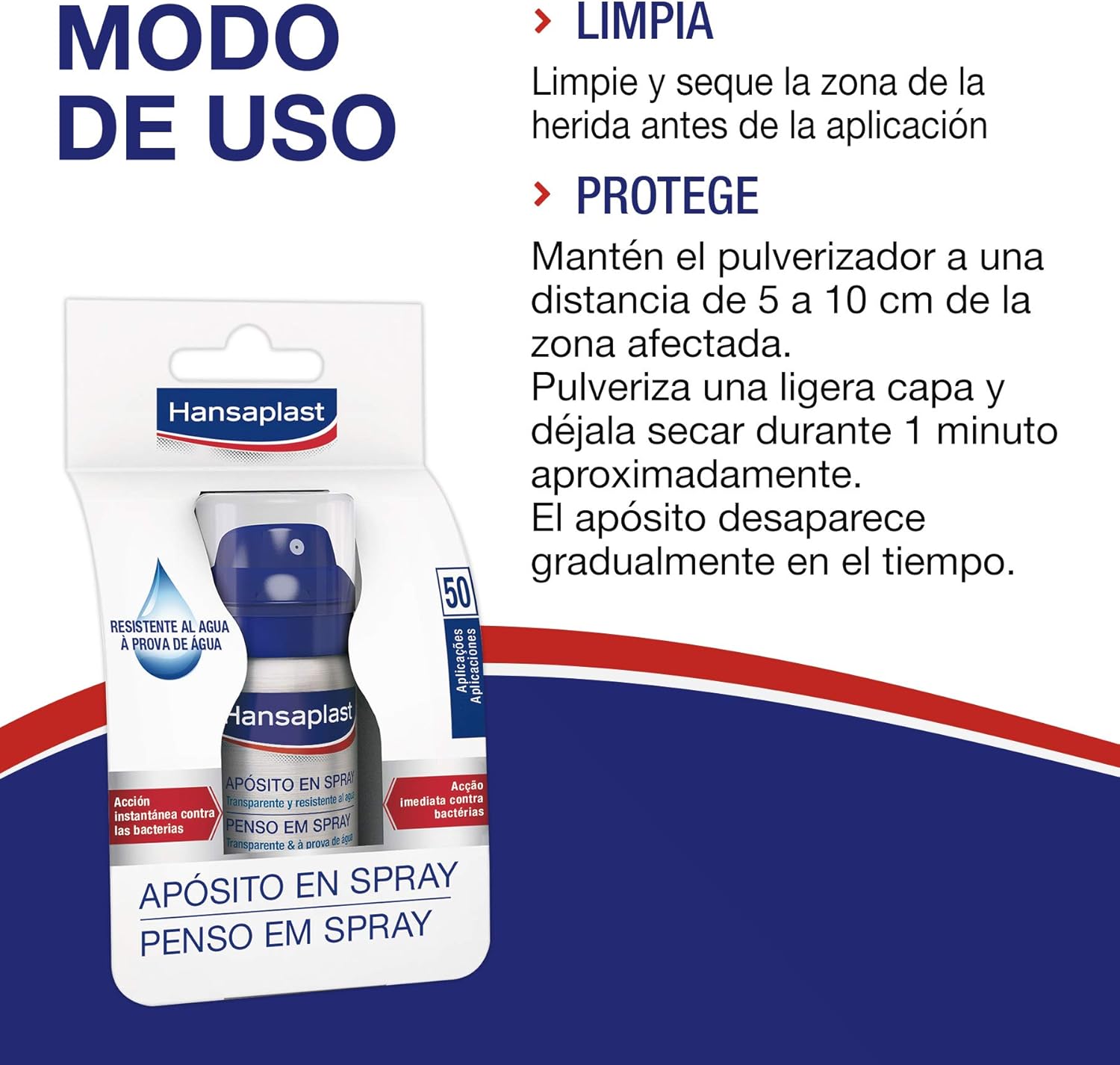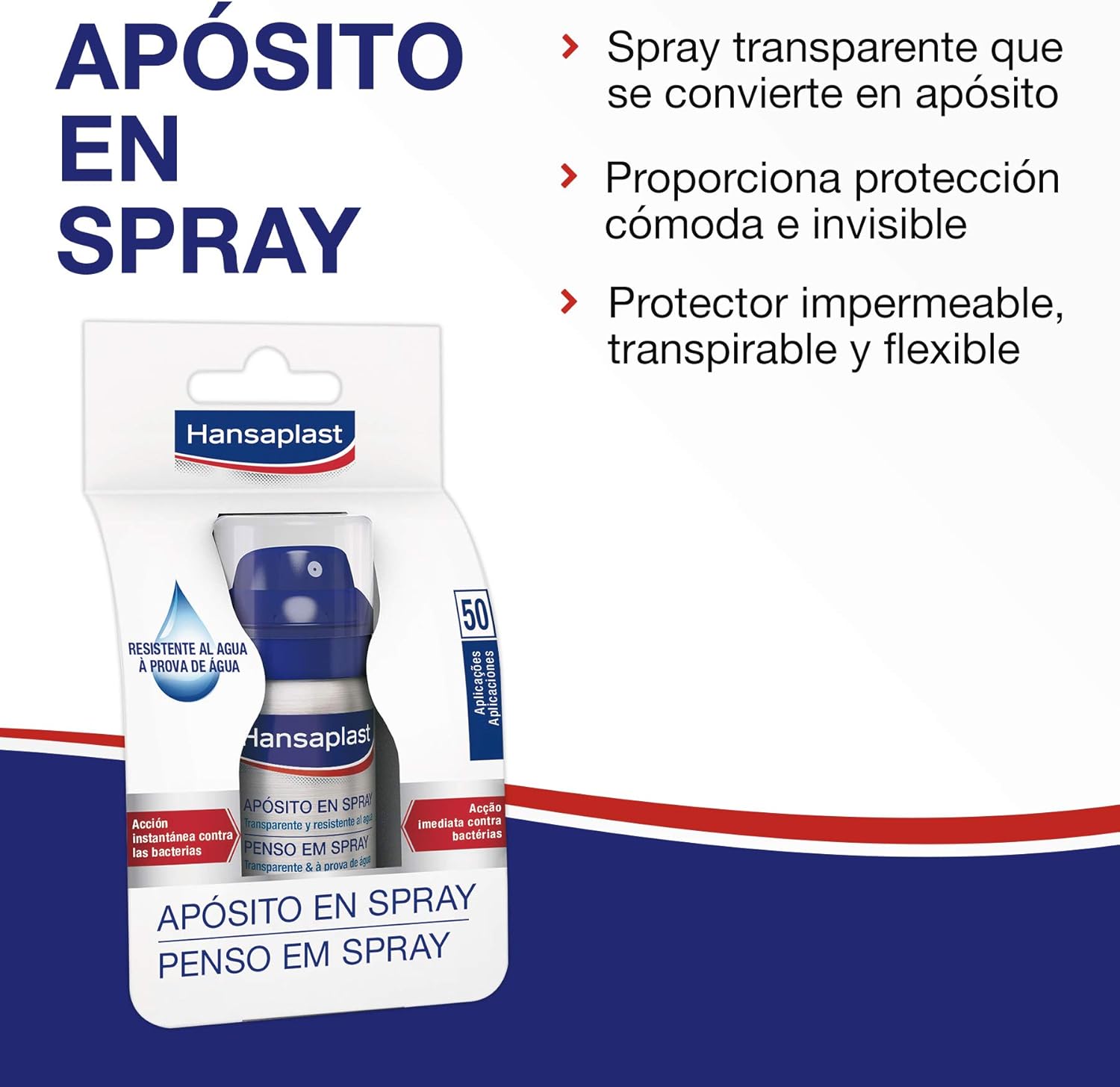 About this item Invisible protection - With Hansaplast spray, small wounds, cuts and minor erosions are protected with a transparent plaster Waterproof Dressings - The spray film is waterproof, breathable and flexible, and adheres like a second skin; suitable for resisting movement Instant Effect - Spray dressing complements any medicine cabinet: instantly protects against bacteria and can be applied in hard-to-reach areas Application - This disinfectant spray is only for small wounds and cuts, not for infected, deep or very bleeding wounds or for burns Practical delivery - Hansaplast Spray dressing for transparent wound protection, immediate effect against bacteria, 1 x 33 ml › See more product details,Invisible protection - With Hansaplast spray, small wounds, cuts and minor erosions are protected with a transparent plaster,Waterproof Dressings - The spray film is waterproof, breathable and flexible, and adheres like a second skin; suitable for resisting movement,Instant Effect - Spray dressing complements any medicine cabinet: instantly protects against bacteria and can be applied in hard-to-reach areas,Application - This disinfectant spray is only for small wounds and cuts, not for infected, deep or very bleeding wounds or for burns,Practical delivery - Hansaplast Spray dressing for transparent wound protection, immediate effect against bacteria, 1 x 33 ml
