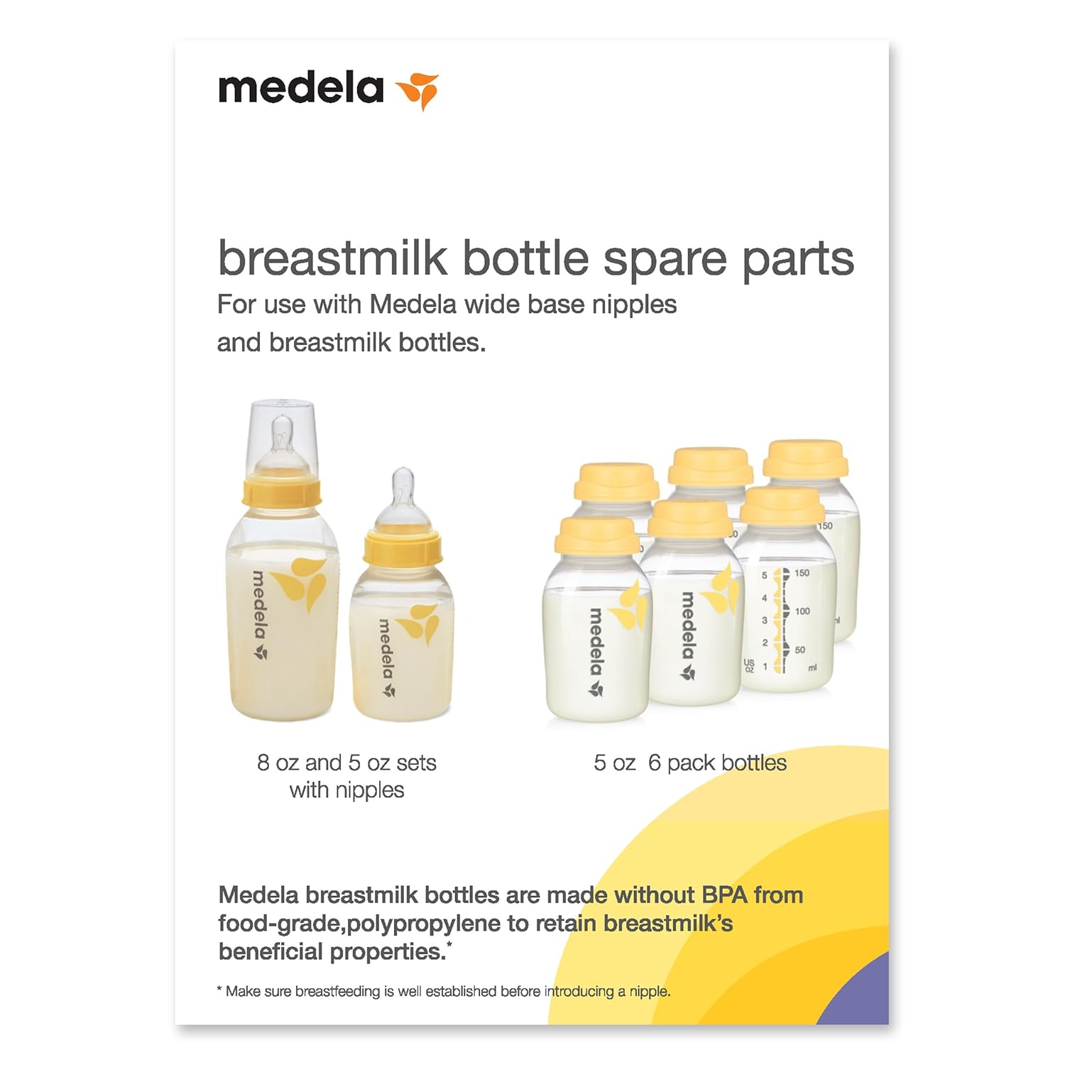 Medela bottle spare parts ensure that you have clean, ready-to-use bottle components handy at all times. The collars, discs, and solid lids included are ideal for efficient long-term breast milk storage, while travel caps keep nipples clean and protected while on the go, commuting, and/or away from home. A convenient mesh bag is included to keep your extra bottle parts together and for easy cleaning in the dishwasher whenever needed. What’s Included: (3) Travel caps; (3) Solid lids; (3) Collars; (3) Discs; (1) Mesh bag All Medela bottle spare parts included are authentic Medela products, designed with the quality, materials, and workmanship that moms expect from us. Inauthentic or counterfeit spare parts may vary significantly in terms of quality and workmanship, which can adversely affect the efficiency of your breast milk bottles. Please note that plastic bottles and their component parts may become brittle when frozen and can break when dropped. Also, bottles and component parts may become damaged if mishandled, dropped, over-tightened, or knocked over. Take appropriate care when handling bottles and components. If bottles or components become damaged, do not use the breast milk. *QuintilesIMS ProVoice Survey; November 2016 – October 2017,Compatible with Medela breast milk bottles and wide base nipples,Convenient mesh bag for cleaning bottle parts in the dishwasher and keeping them together,Includes three sets of travel caps, collars, discs and solid lids,Made without BPA