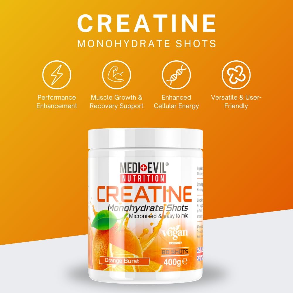 Medi-Evil Nutrition Creatine Monohydrate Shots Powder Vegan Friendly, Orange Burst Flavour, 400G, 80 Servings, Micronised For Easy Mixing (Pack Of 1 Tub)