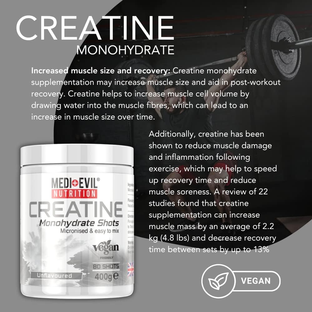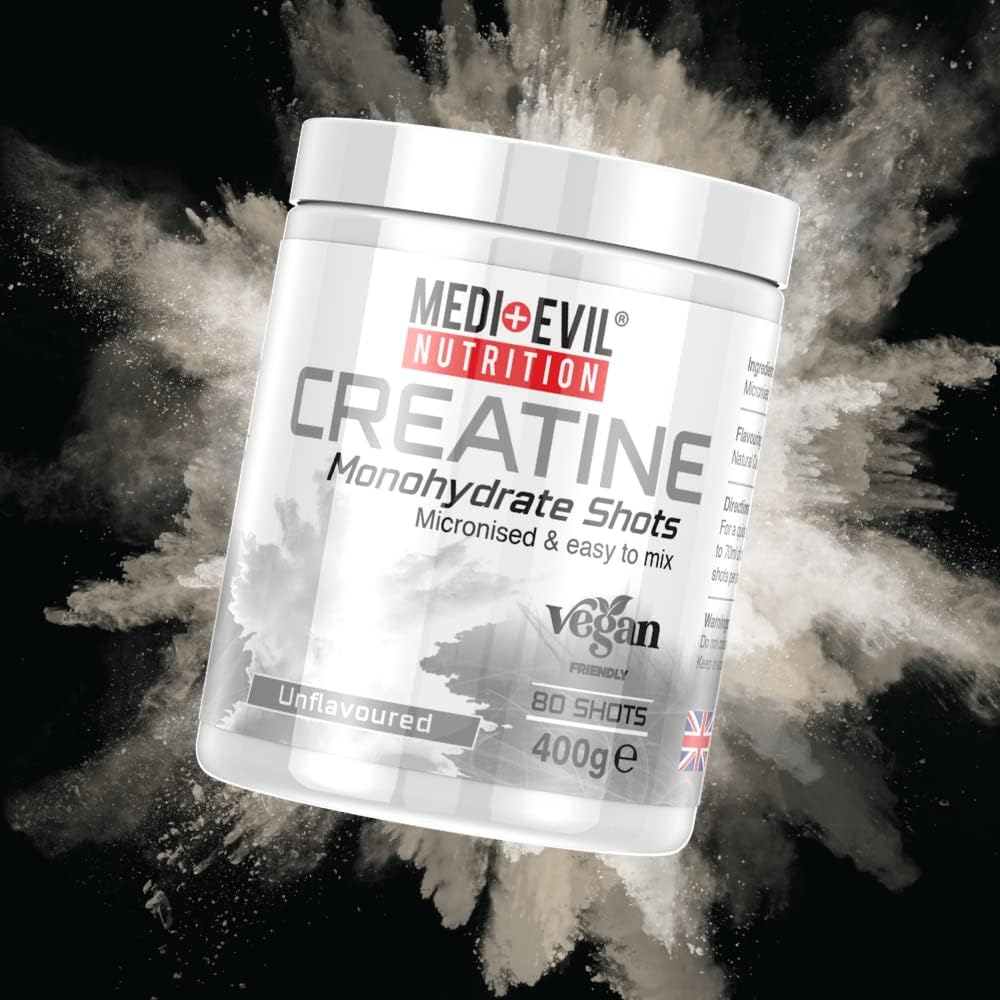 Medi-Evil Nutrition Creatine Monohydrate Shots Powder Vegan Friendly, Unflavoured, No Flavour, 400G, 80 Servings, Micronised For Easy Mixing (Pack Of 1 Tub)