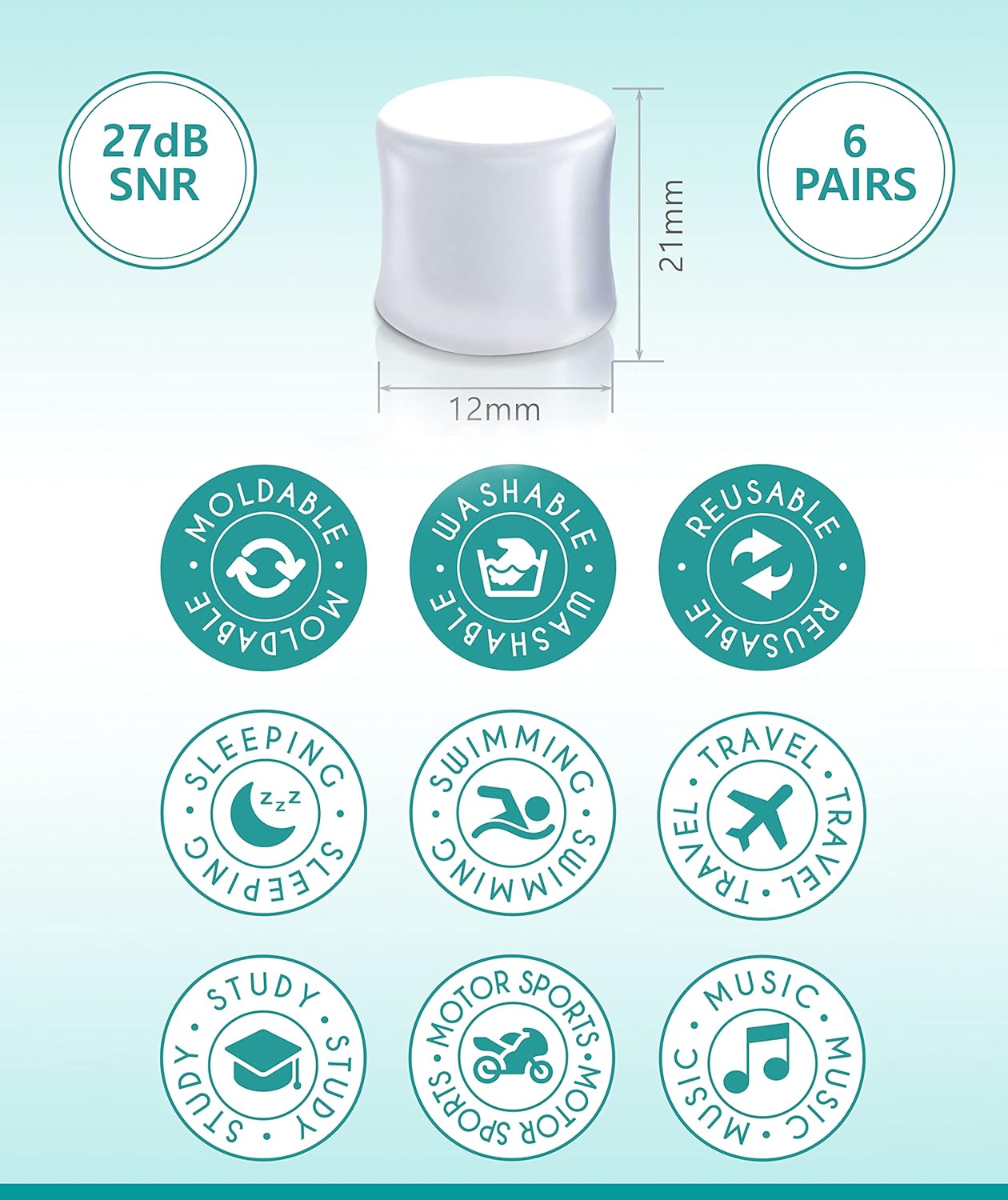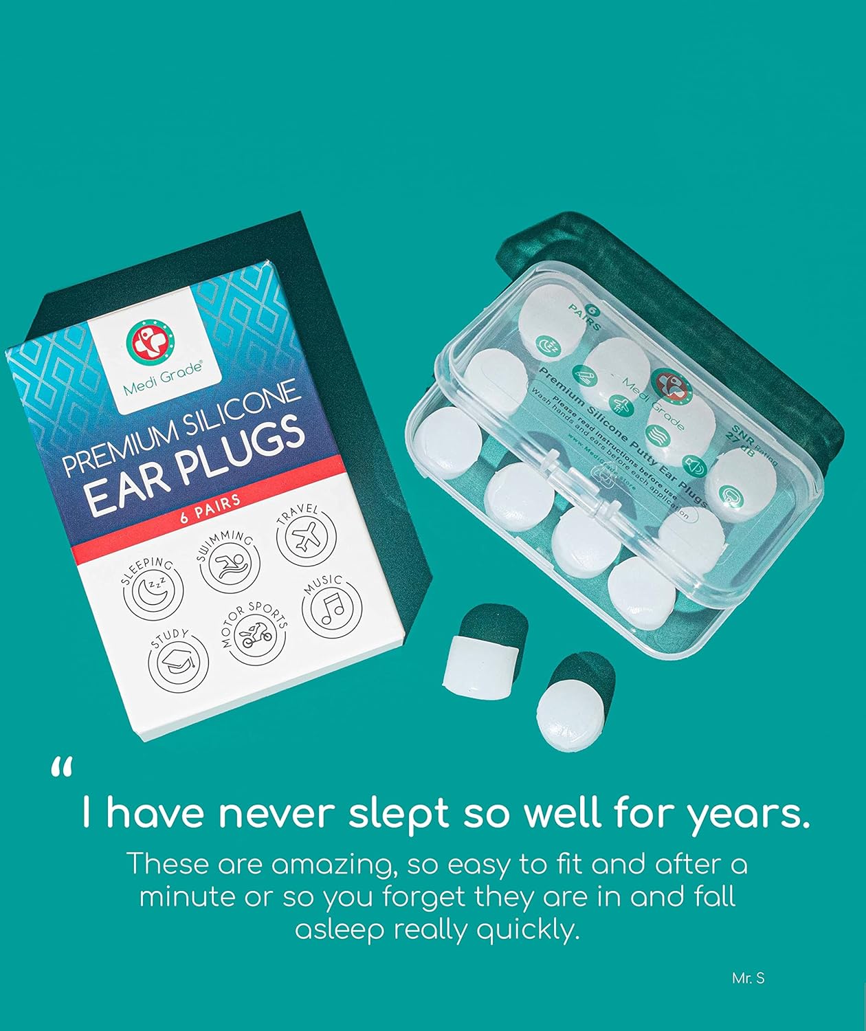 Medi Grade Premium Silicone Ear Plugs For Sleep, 6 Pairs, 27Db - Mouldable And Reusable Noise Cancelling Silicone Ear Plugs For Sleeping, Swimming And Concerts - Ear Plugs Noise Cancelling