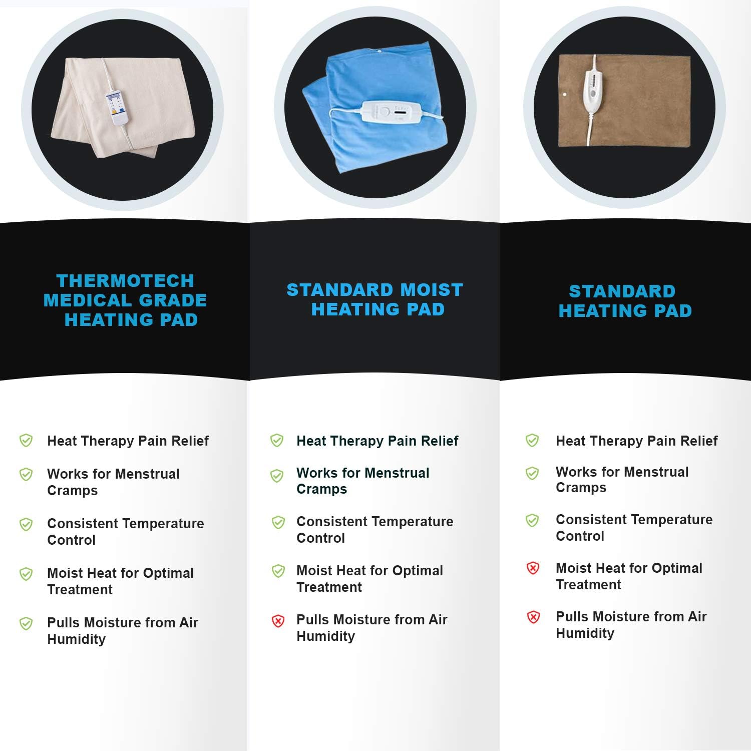 WHY MOIST HEAT IS SUPERIOR: You might have heard that dry heat is fine for loosening muscles and easing pain. Though it does have some benefits, studies have shown that moist heat has greater benefits than dry heat. The heat from Thermotechâs moist heating pad helps moisture get through the skin barrier and deeper into the tissue beneath. This helps to increase circulation to problem areas, bringing in new blood cells while taking away wastes to speed up recovery