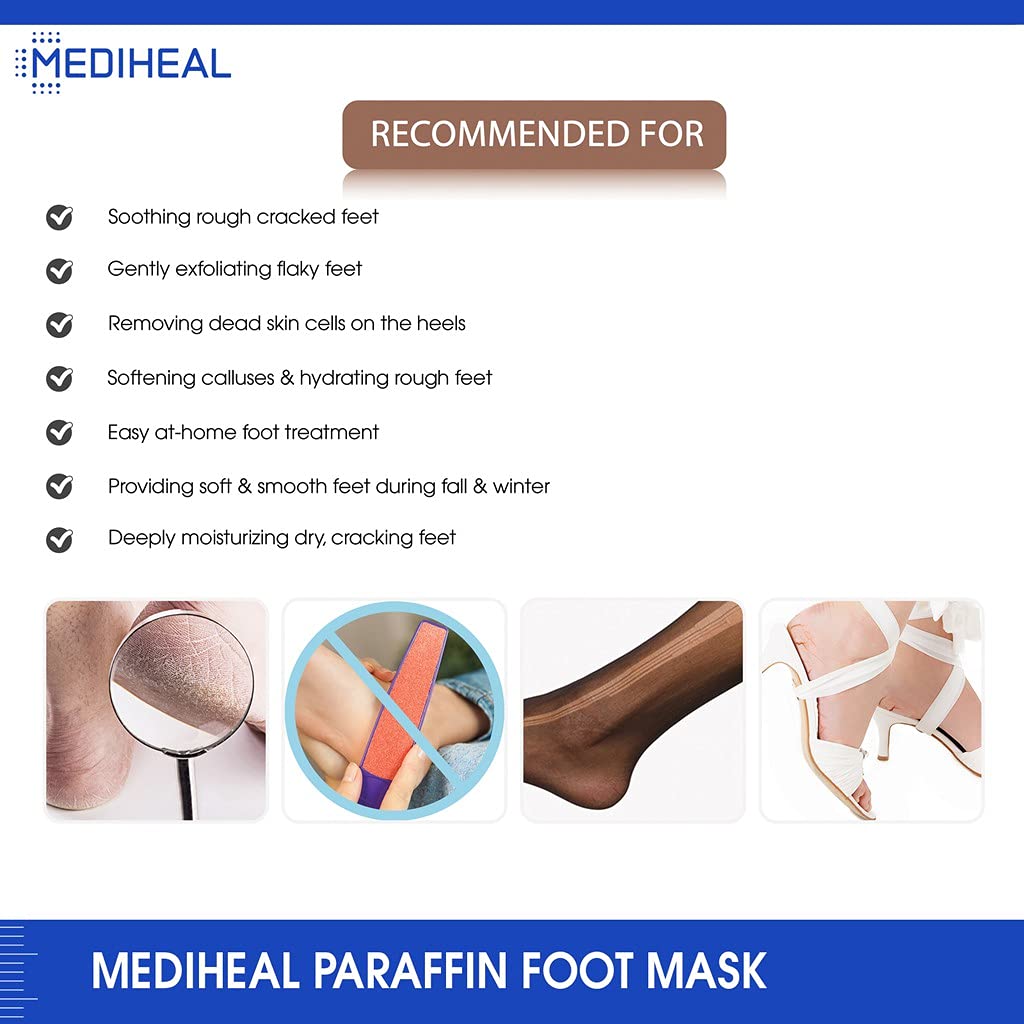 - INTENSIVE CARE FOOT MASK: Mediheal Paraffin Foot Mask contains a rich blend of hydrating and exfoliating elements that will help improve the appearance of your ankles. This foot exfoliator peeling mask is beneficial for those with dry, thickened, and rough skin.