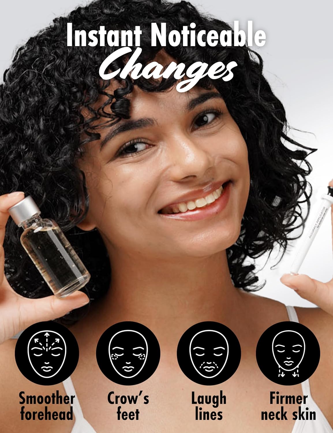 TARGETED AGE-DEFYING SOLUTION. Experience a specialized solution targeting wrinkles and enhancing skin elasticity with this ampoule and serum. Embrace its unique formula that adheres to the skin between wrinkles to deliver focused care for a smoother and tighter complexion during absorption