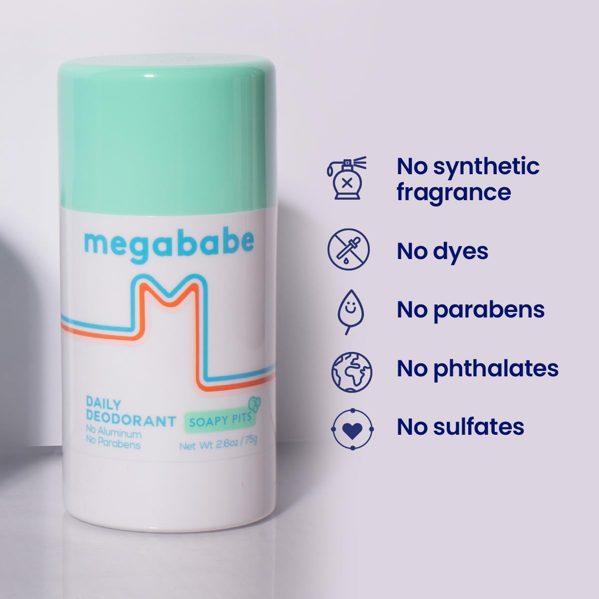 Megababe Daily Deodorant - Soapy Pits | Aluminum-Free, Clear & Clean | 2.6 Oz