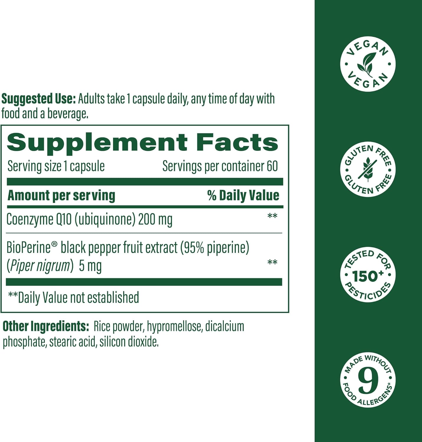 About this item SUPPORTS HEART HEALTH & CELLULAR ENERGY PRODUCTION: This Co Q 10 supplement helps support heart health; Supports healthy blood pressure levels already within normal range, cellular energy production, and more; 200mg CoQ10 per serving+ ENHANCED ABSORPTION COQ10: This Co Q10 supplement is crafted with BioPerine(2) Black Pepper extract to support enhanced absorption+ ANTIOXIDANT SUPPORT FOR HEALTHY AGING: CoQ10 levels decrease with age; This Coenzyme Q10 supplement provides antioxidant support to protect cells from oxidative damage as well as help support brain health and physical exercise+ TAKE ANY TIME OF DAY: Adults take one capsule daily, any time of day with food and a beverage; Bottle contains 60 capsules for 60 servings FREE FROM COMPROMISE: Vegan, gluten-free, tested for 150 chemical substances, GMP quality assured, and made without the top nine food allergens including milk, eggs, peanuts, tree nuts, soy, wheat, fish, shellfish, and sesame  See more product details,SUPPORTS HEART HEALTH & CELLULAR ENERGY PRODUCTION: This Co Q 10 supplement helps support heart health; Supports healthy blood pressure levels already within normal range, cellular energy production, and more; 200mg CoQ10 per serving+,ENHANCED ABSORPTION COQ10: This Co Q10 supplement is crafted with BioPerine(2) Black Pepper extract to support enhanced absorption+,ANTIOXIDANT SUPPORT FOR HEALTHY AGING: CoQ10 levels decrease with age; This Coenzyme Q10 supplement provides antioxidant support to protect cells from oxidative damage as well as help support brain health and physical exercise+,TAKE ANY TIME OF DAY: Adults take one capsule daily, any time of day with food and a beverage; Bottle contains 60 capsules for 60 servings,FREE FROM COMPROMISE: Vegan, gluten-free, tested for 150 chemical substances, GMP quality assured, and made without the top nine food allergens including milk, eggs, peanuts, tree nuts, soy, wheat, fish, shellfish, and sesame