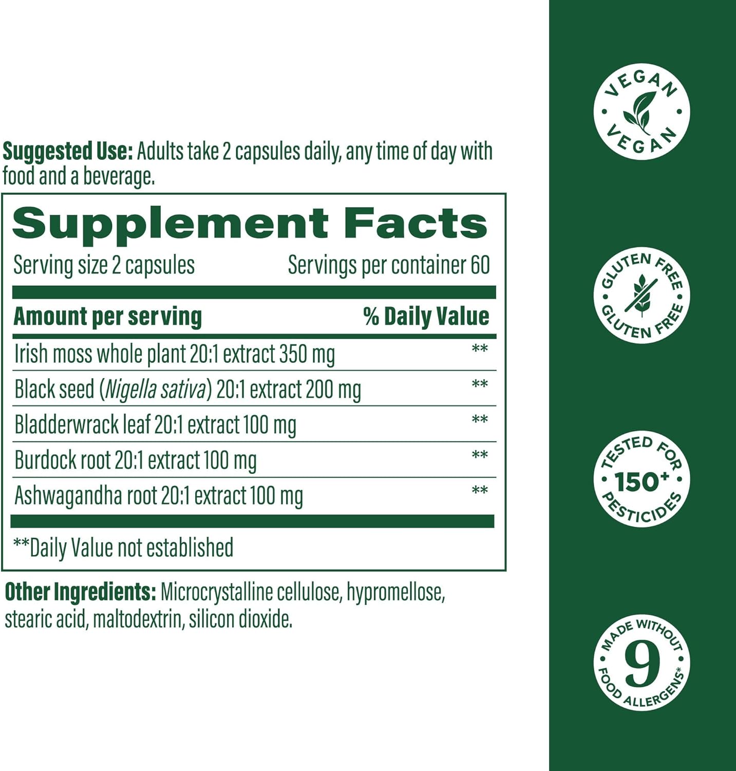 About this item 5-IN-1 FORMULA: Concentrated 20:1 extracts equivalent to 7000mg Irish Sea Moss, 4000mg Black Seed Oil, 2000mg Bladderwrack, 2000mg Burdock Root, and 2000mg Ashwagandha per serving SUPPORTS IMMUNE, SKIN & GUT HEALTH: Formulated to help support immune, skin (1), and gut health as well as a healthy stress response+ JOINT & ANTIOXIDANT SUPPORT: Black Seed extract helps maintain joint comfort; Irish Sea Moss and Bladderwrack have antioxidant properties that help fight free radicals+ TAKE ANY TIME OF DAY: Adults take two Irish Sea Moss capsules any time of day with food and a beverage; Bottle contains 120 capsules for 60 servings FREE FROM COMPROMISE: This complex of Sea Moss, Bladderwrack, Burdock Root, Black Seed Oil, and Ashwagandha for women and men is Vegan, Gluten Free, tested for 150 chemical substances, GMP quality assured, and made without the nine top food allergens including milk, eggs, peanuts, tree nuts, soy, wheat, fish, shellfish, and sesame See more product details,5-IN-1 FORMULA: Concentrated 20:1 extracts equivalent to 7000mg Irish Sea Moss, 4000mg Black Seed Oil, 2000mg Bladderwrack, 2000mg Burdock Root, and 2000mg Ashwagandha per serving,SUPPORTS IMMUNE, SKIN & GUT HEALTH: Formulated to help support immune, skin (1), and gut health as well as a healthy stress response+,JOINT & ANTIOXIDANT SUPPORT: Black Seed extract helps maintain joint comfort; Irish Sea Moss and Bladderwrack have antioxidant properties that help fight free radicals+,TAKE ANY TIME OF DAY: Adults take two Irish Sea Moss capsules any time of day with food and a beverage; Bottle contains 120 capsules for 60 servings,FREE FROM COMPROMISE: This complex of Sea Moss, Bladderwrack, Burdock Root, Black Seed Oil, and Ashwagandha for women and men is Vegan, Gluten Free, tested for 150 chemical substances, GMP quality assured, and made without the nine top food allergens including milk, eggs, peanuts, tree nuts, soy, wheat, fish, shellfish, and sesame