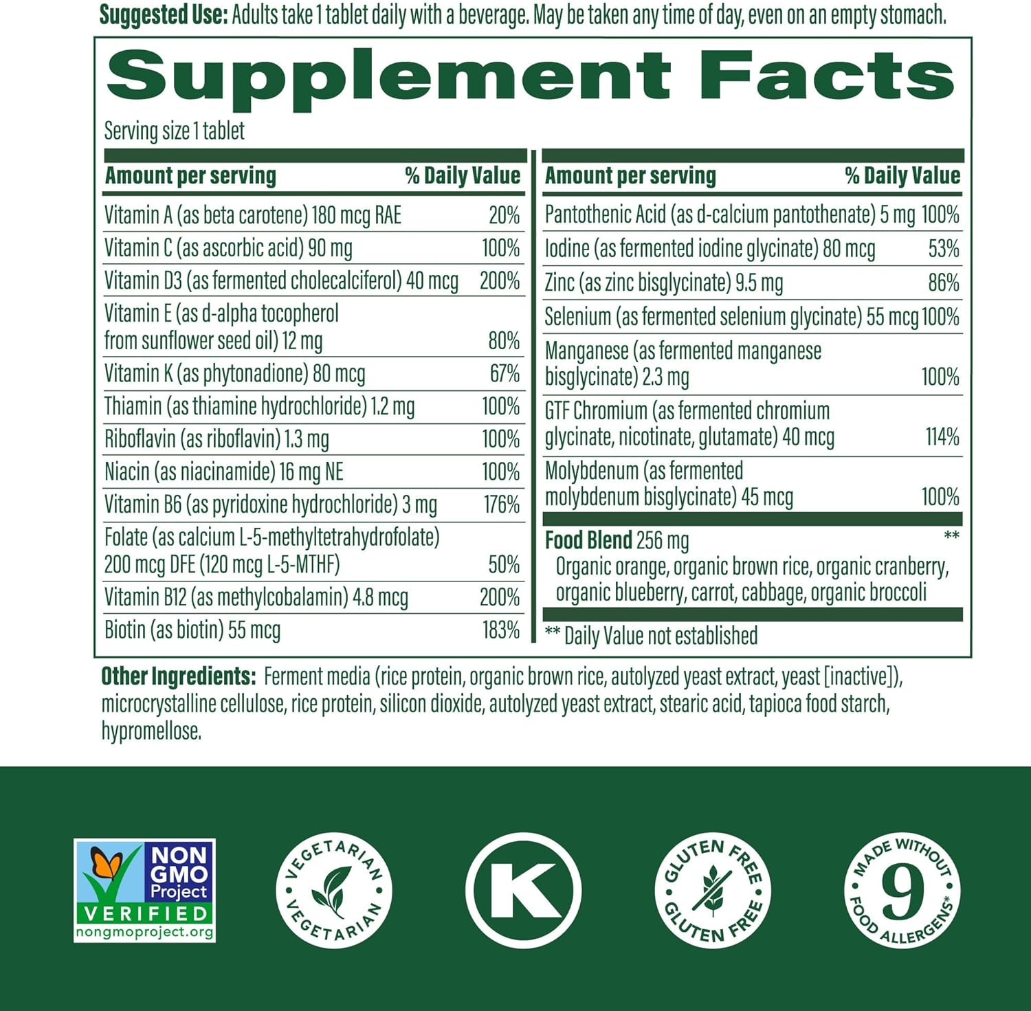 About this item One daily multi with 19 essential vitamins & minerals including antioxidant vitamins A, C, and E for optimal aging support. Plus real food Contains 200% DV of easily absorbed D3 to help keep Bones Strong; B12 & B6 to support Cellular Energy Production and Metabolism; C, D, and zinc to support Immune Function Womens Multivitamin made with Real Food including oranges, broccoli, blueberries, and carrots All of our multivitamins are made with food-paired vitamins and fermented minerals, and can be taken any time of day, even on an empty stomach. 1 tablet daily Non-GMO, Vegetarian; Tested for over 125 chemical substances; Made without 9 allergens: milk, eggs, peanuts, tree nuts, soy, wheat, fish, shellfish, and sesame; Gluten-Free See more product details,One daily multi with 19 essential vitamins & minerals including antioxidant vitamins A, C, and E for optimal aging support. Plus real food,Contains 200% DV of easily absorbed D3 to help keep Bones Strong; B12 & B6 to support Cellular Energy Production and Metabolism; C, D, and zinc to support Immune Function,Womens Multivitamin made with Real Food including oranges, broccoli, blueberries, and carrots,All of our multivitamins are made with food-paired vitamins and fermented minerals, and can be taken any time of day, even on an empty stomach. 1 tablet daily,Non-GMO, Vegetarian; Tested for over 125 chemical substances; Made without 9 allergens: milk, eggs, peanuts, tree nuts, soy, wheat, fish, shellfish, and sesame; Gluten-Free