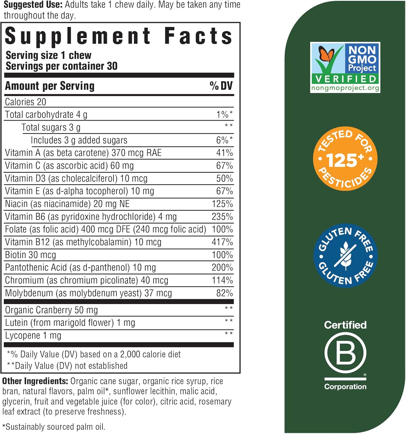 About this item Daily support for women with essential vitamins and minerals to help fill nutritional gaps in the diet Contains B vitamins to support cellular energy and nervous system health; Biotin for skin and hair health; and Vitamin D3 to support strong bones Low In Sugar: Delicious mixed berry flavor with only 3 grams of sugar per serving Convenient, individually wrapped chews can be taken on-the-go, any time of day, even on an empty stomach. 1 chew daily. Suitable for vegetarian diets Non-GMO, Vegetarian; Tested for over 125 chemical substances; Made without 9 allergens: milk, eggs, peanuts, tree nuts, soy, wheat, fish, shellfish, and sesame; Gluten-Free See more product details,Daily support for women with essential vitamins and minerals to help fill nutritional gaps in the diet,Contains B vitamins to support cellular energy and nervous system health; Biotin for skin and hair health; and Vitamin D3 to support strong bones,Low In Sugar: Delicious mixed berry flavor with only 3 grams of sugar per serving,Convenient, individually wrapped chews can be taken on-the-go, any time of day, even on an empty stomach. 1 chew daily. Suitable for vegetarian diets,Non-GMO, Vegetarian; Tested for over 125 chemical substances; Made without 9 allergens: milk, eggs, peanuts, tree nuts, soy, wheat, fish, shellfish, and sesame; Gluten-Free