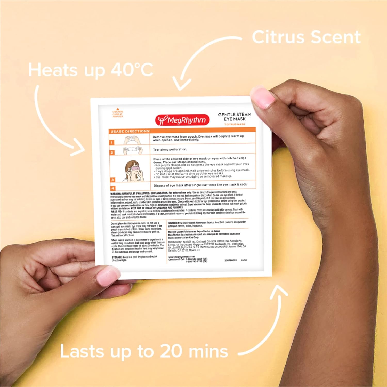 Give your eyes a chance to relax! The MegRhythm Gentle Steam Eye Mask is ideal for puffy eyes. Its warm, gentle steam is rejuvenating and relaxes tension to leave you feeling relaxed and peaceful after working, traveling, or extensive screen time. It uses unique warming technology to gradually warm up and provide relief to hardworking eyes. Satisfaction Guaranteed. Limitations may apply,SOOTHES AND RELAXES HARDWORKING EYES - Perfect for use after a long day of working, traveling, or excessive screen time, our lightweight mask nourishes hardworking eyes for relief after 10 minutes,GENTLE, STEAM MASK - Our Steam Eye Mask features unique warming technology that warms the mask as soon as the pack is opened and provides immediate relaxation for hardworking eyes,WITH DAILY USE- Eyes will feel relaxed, soothed, and look less puffy,MOOD-BOOSTING CITRUS - Invigorate your eyes and give yourself a boost after a long day with the citrus-scented MegRhythm Steam Mask,COMPACT PACKAGING PERFECT FOR TRAVEL - The light, compact MegRhythm packaging is perfect for including on your next work trip or vacation