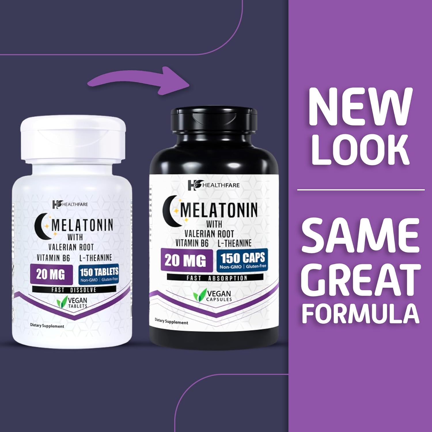 Melatonin 20Mg | 150 Veg Capsules | Complex With L-Theanine | Valerian Root & Vitamin B6 | Vegetarian Formula | Non-Gmo | Gluten-Free | Made In The Usa