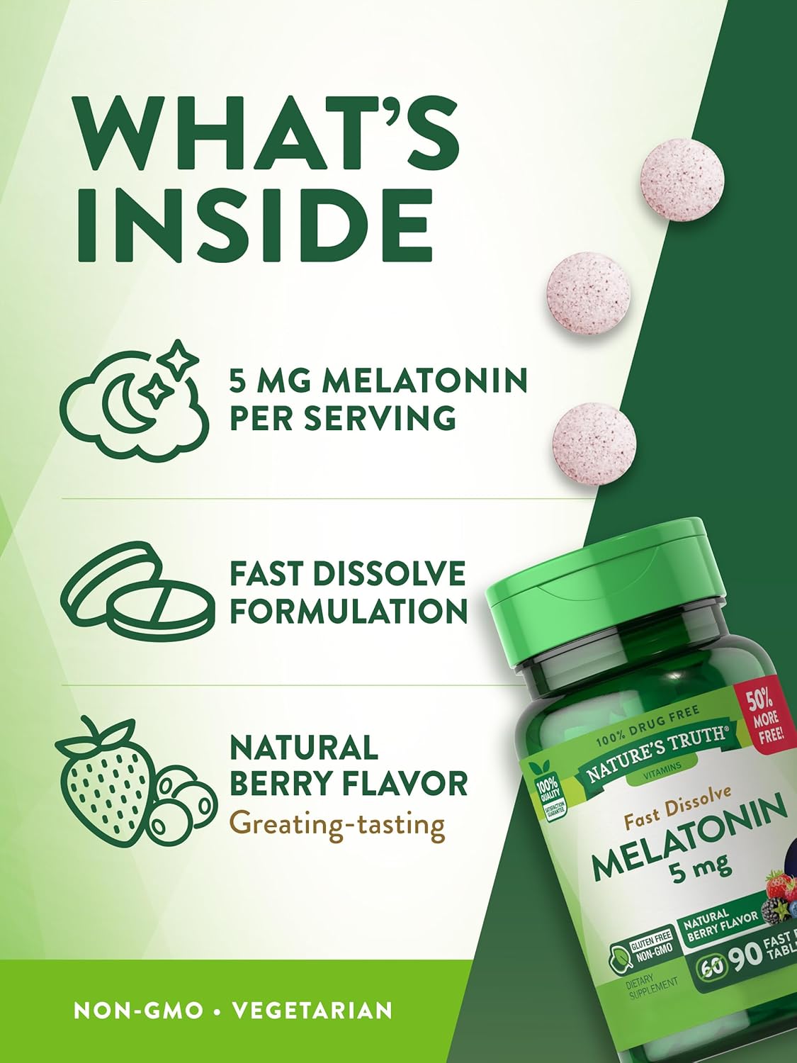 What Is Melatonin Melatonin Is Naturally Produced By The Body And Works In Harmony With Your Natural Cycle.** The Body’S Ability To Produce This Naturally Occurring Hormone May Begin To Decline With Age, So You Can Support It With A Trusted Melatonin Supplement. Nature’S Truth Melatonin Fast Dissolve Tablets Each Fast Dissolve Tablet Delivers A Dose Of 5 Mg Of Melatonin. This 100% Drug Free Formula Can Easily Be Added Into Your Nighttime Routine. Plus, These Dissolvable Tablets Are Vegetarian Friendly And Have A Delicious Natural Berry Flavor. Nature’S Truth: Where Wellness Begins Our Mission At Nature’S Truth Is To Meet Your Wellness Needs With Products That Go Above And Beyond. Nature’S Truth Provides Supplements In Various Delivery Forms, Such As Capsules, Softgels, Chewables, Tablets, Powders, Liquids, And Gummies To Suit Every Preference. Our Melatonin Is Vegetarian, Non-Gmo, And Free Of Gluten, Yeast, Milk, Lactose, Soy, Artificial Flavor, And Preservatives. **This Statement Has Not Been Evaluated By The Food And Drug Administration. This Product Is Not Intended To Diagnose, Treat, Cure, Or Prevent Any Disease