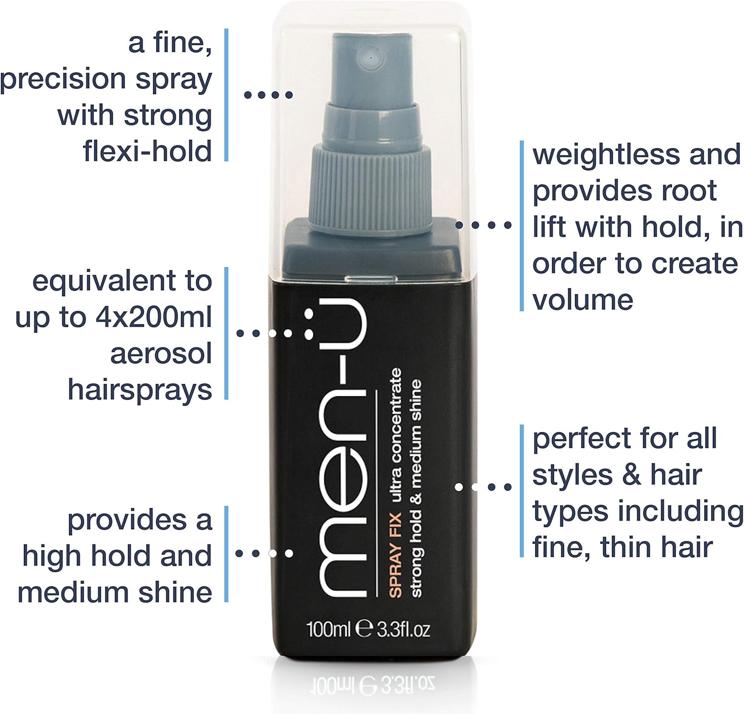 Men-U Mens Hair Spray Fix 100Ml – Hair Gel Spray, High Hold And Medium Shine. Root Lift With Hold To Create Volume – Ultra Concentrate, Longer Lasting. Hairspray Men, 100Ml Bottle Refill
