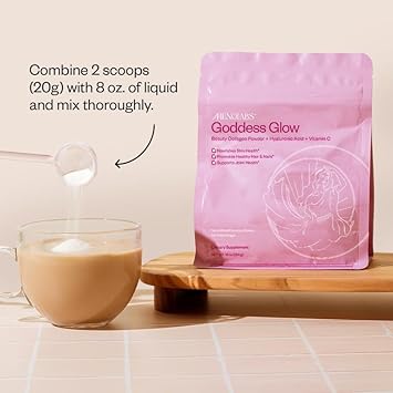 About this item Nourish your inner goddess: Our Goddess Glow is made with hydrolyzed collagen powder to help boost beauty and strength during menopause from the inside out* Strengthens hair, skin and nails: This collagen powder for women contains essential amino acids that help provide structure to hair follicles and nails, and type 1 collagen for skin elasticity* Antioxidant Support: Formulated with vitamin C to promote protection from free radicals and collagen production while helping maintain the health of connective tissues for a healthier appearance* Joint Health support: Goddess Glow contains hydrolyzed collagen peptides and Vitamin C to support joint health by helping bones absorb calcium and other vital nutrients, increasing density and strength; also maintains the health of the tendons and ligaments* Has no added flavor so works well with coffee and smoothie recipes See more product details,Nourish your inner goddess: Our Goddess Glow is made with hydrolyzed collagen powder to help boost beauty and strength during menopause from the inside out,Strengthens hair, skin and nails: This collagen powder for women contains essential amino acids that help provide structure to hair follicles and nails, and type 1 collagen for skin elasticity,Antioxidant Support: Formulated with vitamin C to promote protection from free radicals and collagen production while helping maintain the health of connective tissues for a healthier appearance,Joint Health support: Goddess Glow contains hydrolyzed collagen peptides and Vitamin C to support joint health by helping bones absorb calcium and other vital nutrients, increasing density and strength; also maintains the health of the tendons and ligaments,Has no added flavor so works well with coffee and smoothie recipes