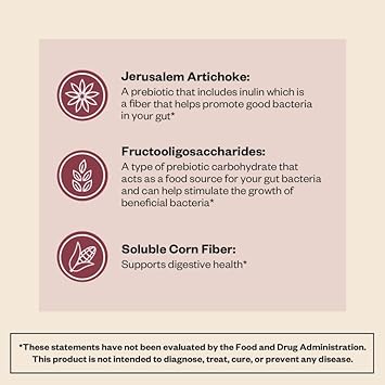 About this item Fiber supplements for women: With quality, non-thickening, clear, taste-free ingredients, this daily prebiotic fiber supplement is expertly-formulated and keeps your gut healthy as estrogen levels fluctuate during menopause by giving it the right kinds of prebiotic fibers* Supports gut health: This fiber supplement helps women achieve a healthy gut through a proprietary blend of three fibers; It also contains essential prebiotics like Fructooligosaccharides which comes from fruits and vegetables* Supports digestion: Formulated with a soluble fiber called inulin from the Jerusalem artichoke which, when digested, becomes a gelatinous substance in the stomach, slowing down digestion and giving your microbiome more time to extract nutrients* Science backed ingredients: This supplement was created with quality ingredients; The corn dextrin in this supplement is the main source of soluble fiber produced from starch; It has many beneficial properties and can help support metabolism and digestion* See more product details,Fiber supplements for women: With quality, non-thickening, clear, taste-free ingredients, this daily prebiotic fiber supplement is expertly-formulated and keeps your gut healthy as estrogen levels fluctuate during menopause by giving it the right kinds of prebiotic fibers,Supports gut health: This fiber supplement helps women achieve a healthy gut through a proprietary blend of three fibers; It also contains essential prebiotics like Fructooligosaccharides which comes from fruits and vegetables,Supports digestion: Formulated with a soluble fiber called inulin from the Jerusalem artichoke which, when digested, becomes a gelatinous substance in the stomach, slowing down digestion and giving your microbiome more time to extract nutrients,Science backed ingredients: This supplement was created with quality ingredients; The corn dextrin in this supplement is the main source of soluble fiber produced from starch; It has many beneficial properties and can help support metabolism and digestion