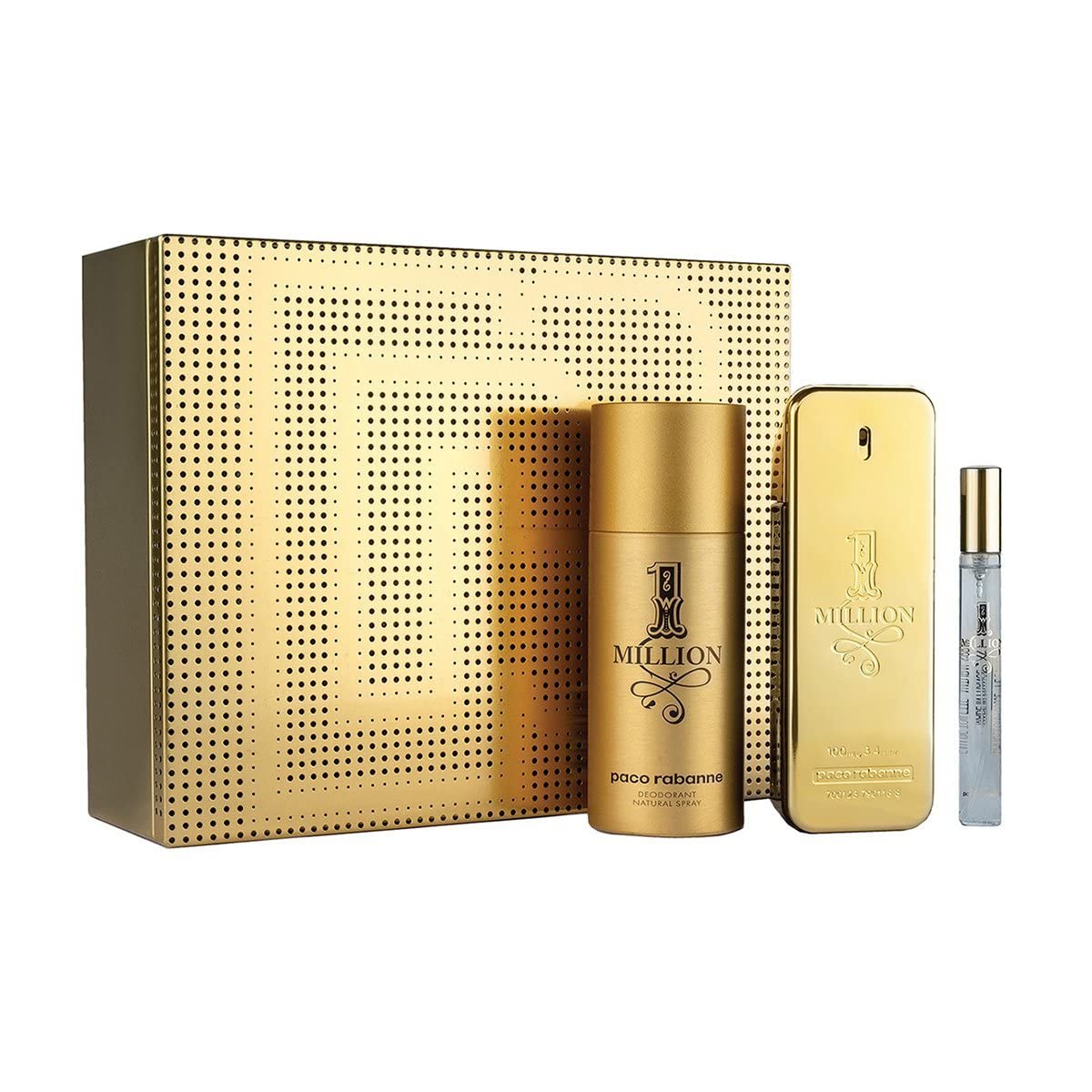 Luxurious Gift Set: Experience the captivating scent of Paco Rabanne's 1 Million for men, now available in a 3-piece set featuring a 3.4 oz Eau De Toilette Spray, 5.1 oz Deodorant Spray, and a 0.33 oz Travel Spray. Perfect for gifting or personal use