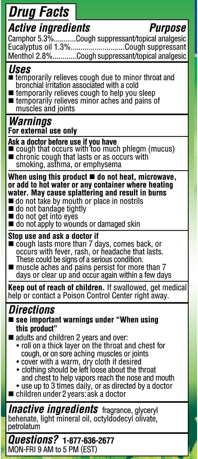 Mentholatum Pain Relief Muscle Chest, Neck, and Back Ointment Roll On,MESS-FREE ROLL ON APPLICATOR β Provides all of the benefits of a chest rub without the greasy mess of traditional ointments, leaving fingers and hands clean and odor-free. Convenient and effective, Mentholatum No Mess Vaporizing Rub cough suppressant and topical analgesic is sure to become your favorite go-to chest rub and topical pain reliever,100% NATURAL ACTIVE INGREDIENTS β Mentholatum No Mess Vaporizing Rub delivers natural camphor, eucalyptus oil, and menthol in a one-of-a-kind ointment-based formula that provides maximum strength cough relief when applied to the throat and chest. Inhalation of the medicated vapors temporarily relieves cough and is soothing to the nasal passages. Its penetrating formula also helps to relief minor aches and pains of muscle and joints,MAXIMUM STRENGTH COUGH RELIEF β Formulated to provide maximum strength cough relief, Mentholatum No Mess Vaporizing Rub when applied to the throat and chest works fast to temporarily relieve cough due to minor throat and bronchial irritation associated with a cold. For topical application only β Safe for children ages 2 and over,RELIEVES MUSCLE ACHES AND PAINS β Mentholatum No Mess Vaporizing Rubβs penetrating formula, plus massaging action of the roll on applicator, helps to relieve minor aches and pains of muscles and joints due to simple backache, arthritis, strains and sprains,RELIEVES COUGH TO HELP YOU SLEEP β Cough due to a cold keeping you up at night Mentholatum No Mess Vaporizing Rub has medicated vapors that temporarily relieves cough to help you or your child sleep β so you can both get the rest you need. Apply to the throat and chest and breathe in the soothing vapors of natural camphor, eucalyptus oil, and menthol β a safe and effective alternative to oral cough medicines