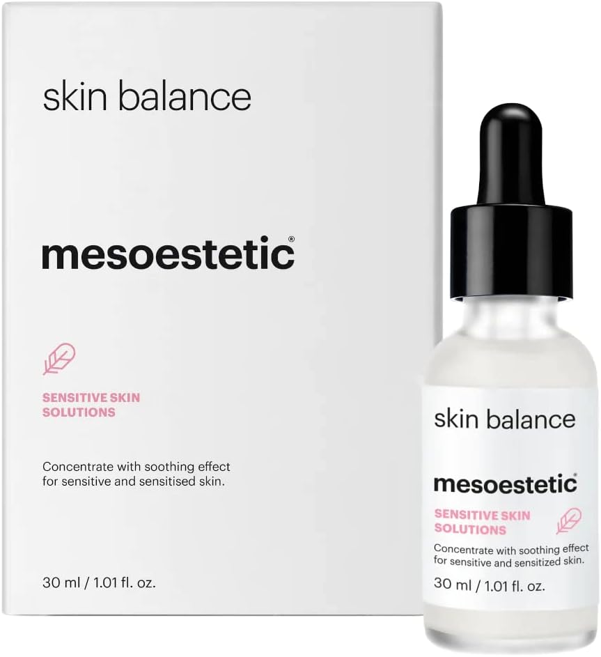 Intense soothing concentrate. Mesoestetic Skin Balance is an intense soothing concentrate that reduces reactive skin manifestations such as redness, itching, burning and irritation. Thanks to the combination and synergy of active ingredients of plant origin, it provides an immediate soothing effect and reduces redness thanks to its effect on inflammation-related mediators. Panthenol, along with aloe vera and calendula extracts, stimulate cell renewal processes to strengthen damaged skin. Why is this This intensive treatment is responsible for soothing sensitized and sensitized skin. It has a bio-balancing and regenerating effect that relieves itching and tingling: Panthenol - It is a soothing and repairing active ingredient. Provides moisturising properties and protects the skin barrier. Stimulates the healing and recovery of irritated and cracked skin. Relieves skin inflammation such as skin erosions. Aloe Vera: moisturising and regenerating active ingredient that helps against premature skin ageing. It stimulates skin regeneration during irritating processes or excessive dryness. Marigold: It has healing and regenerating properties. It is anti-inflammatory and anti-allergic. Soothes burning and itching. Who can use it It is a care designed and formulated to stop reactive processes of the skin such as redness, itching, burning or irritation. For sensitive, sensitized or aggressively treated skin. How should it be applied The application protocol,Soothing effect,Improved effect,Biodegradable,Antioxidant