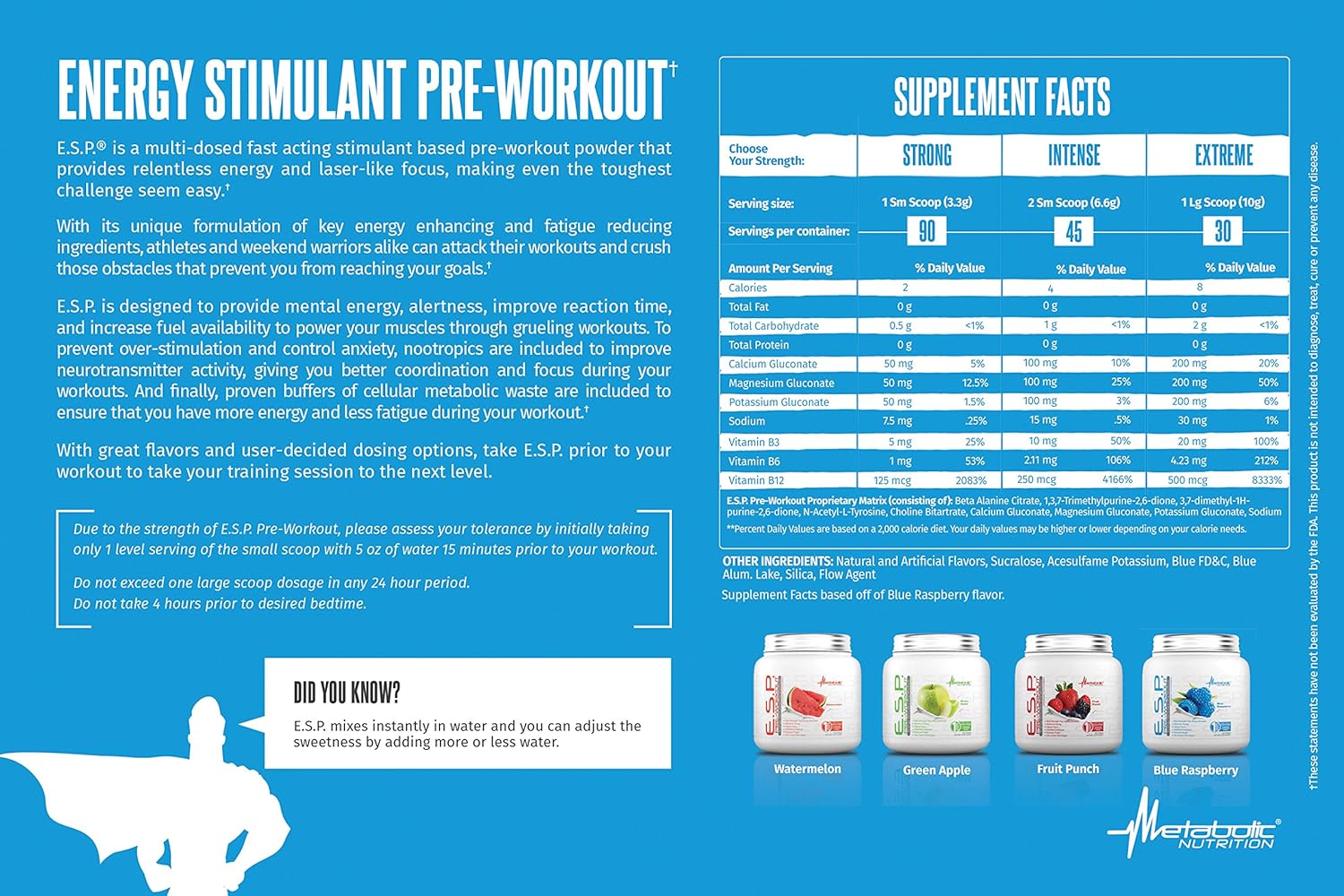 About this item E.S.P. (Energy Stimulant Pre-Workout) by metabolic nutrition is a complete training fuel for professional and recreational athletes, which is most effective, high-energy, no crash, and containing a synergistic matrix of performance-boosting carbohydrates, electrolytes, amino acids, and blood flow enhancers. It is a fast-acting pre-workout stimulant on the market which offers laser sharp focus and explosive power in every scoop A high-potency stimulant driven pre-workout product designed for men and women of all training levels to deliver maximal energy while controlling focus, Supports Cognitive Function, Enhances Mood, Expands Muscle Endurance, and Helps to Delay Fatigue The rapid absorbing ingredients in E.S.P. will provide a burst of stimulant energy exciting your nervous system while giving you clear focus as to the task at hand. The combined ingredients within this workout supplement utilize stimulants to provide mental energy, alertness, improve reaction time, and help to increase fuel mobilization to power your muscles For a fiercer workout session & incredible Muscle Pump and Recovery with Increased blood flow to the muscles try ESP now! Use the specialized scoop to determine the amount you use so that you can dial in your need based on the workout you are doing Available in 4 different flavors – Blue Raspberry, Green Apple, Fruit Punch And water melon; E.S.P is Picamilon or Pikatropin Free and Zero Crash / Zero Sugar See more product details,E.S.P. (Energy Stimulant Pre-Workout) by metabolic nutrition is a complete training fuel for professional and recreational athletes, which is most effective, high-energy, no crash, and containing a synergistic matrix of performance-boosting carbohydrates, electrolytes, amino acids, and blood flow enhancers. It is a fast-acting pre-workout stimulant on the market which offers laser sharp focus and explosive power in every scoop,A high-potency stimulant driven pre-workout product designed for men and women of all training levels to deliver maximal energy while controlling focus, Supports Cognitive Function, Enhances Mood, Expands Muscle Endurance, and Helps to Delay Fatigue,The rapid absorbing ingredients in E.S.P. will provide a burst of stimulant energy exciting your nervous system while giving you clear focus as to the task at hand. The combined ingredients within this workout supplement utilize stimulants to provide mental energy, alertness, improve reaction time, and help to increase fuel mobilization to power your muscles,For a fiercer workout session & incredible Muscle Pump and Recovery with Increased blood flow to the muscles try ESP now! Use the specialized scoop to determine the amount you use so that you can dial in your need based on the workout you are doing,Available in 4 different flavors – Blue Raspberry, Green Apple, Fruit Punch And water melon; E.S.P is Picamilon or Pikatropin Free and Zero Crash / Zero Sugar