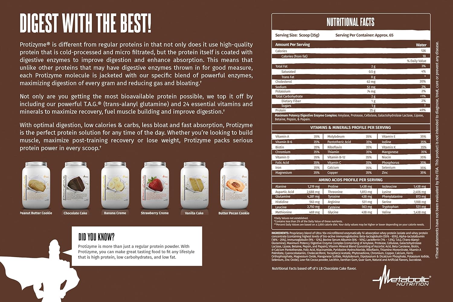 About this item Protizyme from the house of Metabolic Nutrition is a 100% whey blend Specially Designed Protein. NO Gluten, No GMO’s, No Lactose, NO Soy Protein, NO Added-Sugar, NO Trans Fat, NO Aspartame, NO Fillers, NO Preservatives, NO Additives, NO Amino Spiking, NO Illegal Substances and NO Gimmicks Physician’s formulated for healthy men & women and designed for on-the-go professionals, athletes, students and competitors alike who need and easy and quick dissolving powder that makes delicious milkshakes and can be used in baking to make high protein cookies, pancakes, muffins, etc. Available in 5 delicious flavors - Vanilla Cake, Strawberry Crème, Chocolate Cake, Peanut Butter Cookie and Banana Crème, and with two sizes to choose from – 2 Lbs. (delivering 26 individual servings) and 5 Lbs. (delivering 52 individual servings). 10x-microfiltered enzymatically whey protein isolate and whey protein concentrate which delivers 24g – 26g Protein, Very Low Sugar: 1g, Very Low Fat: 1.5g, Low Sodium, Low Cholesterol, and Low Calories: 122 calories per serving. Each serving also contains 5.6 grams of BCAA’s & 4.2 grams of L-Glutamine. Protizyme enzymatically coated protein works synergistically with your body to digest easily and absorb quickly. Fortified with 24 vitamins and minerals, to provide a well-balanced nutritious high protein meal. High quality protein fuels muscle growth, increase strength and speed recovery by increasing protein synthesis to help push your performance and physique to the next level. See more product details,Protizyme from the house of Metabolic Nutrition is a 100% whey blend Specially Designed Protein. NO Gluten, No GMO’s, No Lactose, NO Soy Protein, NO Added-Sugar, NO Trans Fat, NO Aspartame, NO Fillers, NO Preservatives, NO Additives, NO Amino Spiking, NO Illegal Substances and NO Gimmicks,Physician’s formulated for healthy men & women and designed for on-the-go professionals, athletes, students and competitors alike who need and easy and quick dissolving powder that makes delicious milkshakes and can be used in baking to make high protein cookies, pancakes, muffins, etc,Available in 5 delicious flavors - Vanilla Cake, Strawberry Crème, Chocolate Cake, Peanut Butter Cookie and Banana Crème, and with two sizes to choose from – 2 Lbs. (delivering 26 individual servings) and 5 Lbs. (delivering 52 individual servings),10x-microfiltered enzymatically whey protein isolate and whey protein concentrate which delivers 24g – 26g Protein, Very Low Sugar: 1g, Very Low Fat: 1.5g, Low Sodium, Low Cholesterol, and Low Calories: 122 calories per serving. Each serving also contains 5.6 grams of BCAA’s & 4.2 grams of L-Glutamine,Protizyme enzymatically coated protein works synergistically with your body to digest easily and absorb quickly. Fortified with 24 vitamins and minerals, to provide a well-balanced nutritious high protein meal. High quality protein fuels muscle growth, increase strength and speed recovery by increasing protein synthesis to help push your performance and physique to the next level