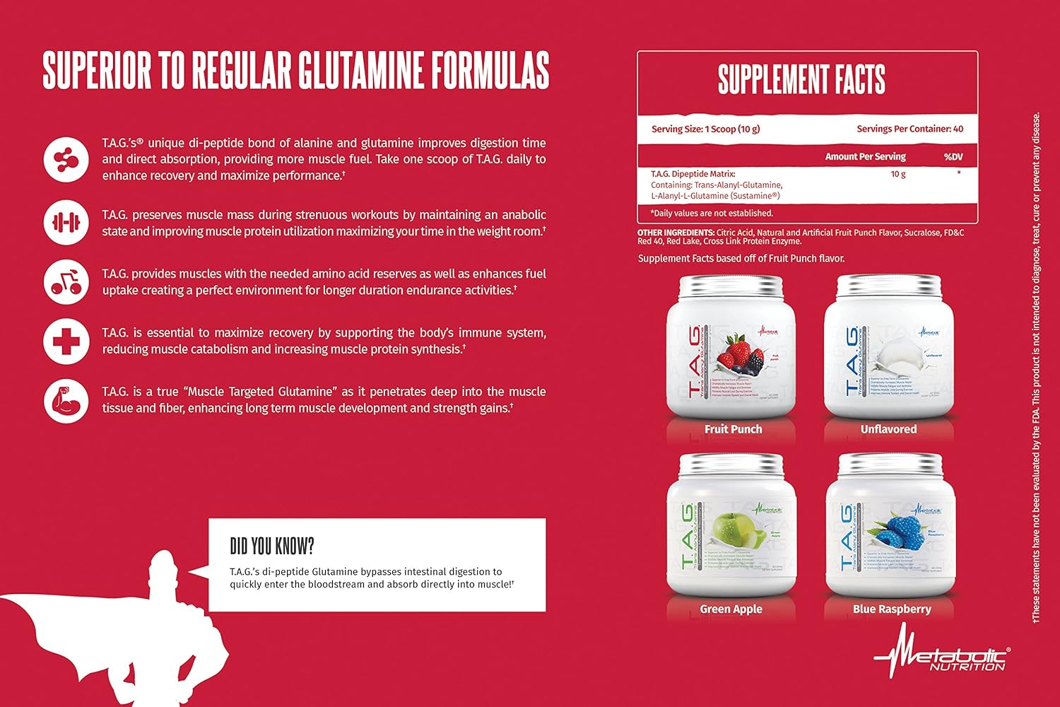 About this item T.A.G. (Trans Alanyl Glutamine) Targeted Muscle Recovery Amino Acid supplies 100% enzymatically and fermented pharmaceutical grade dipeptide L-Alanyl L-Glutamine which delivers a massive 10g dosage per scoop. By supplementing yourself with glutamine, you can enhance your health and experience a reduced rate of infections. T.A.G. (Trans Alanyl Glutamine) Targeted Muscle Recovery Amino Acid is physician formulated & designed for healthy Men or Women who are on-the-go professionals, athletes, students and competitors alike, who need and easy and quick dissolving L-Glutamine powder that tastes great and works even better to enhance their athletic training and physical recovery. Available in 3 delicious flavors, as well as, Unflavoredā¦in 400g sizeā¦delivering 40 individual servings. T.A.G. (Trans Alanyl Glutamine) di-peptide Amino Acid out performs regular L-Glutamine by bypassing regular digestion and absorbs quickly into the bloodstream for enhanced muscle growth, increase strength, prevent muscle loss and speed recovery by increasing serum amino acid levels leading to increase protein synthesis to help push your performance and physique to the next level. T.A.G. also works to support a healthier Immune Function. T.A.G. is a superior form of Glutamine because it's 100% absorbed into the bloodstream and delivered right to the muscles boosting the recovery process and restricts muscle breakdown. Designed to improve muscle recovery and repair, T.A.G. stops the loss of muscle glutamine while training. T.A.G. is also helpful in boosting the immunity levels and also is responsible for vasodilation which enables enhanced blood flow to your muscles and boosts oxygen supply. Suitable for Men & Women, T.A.G. have NO Calories, NO Gluten, No GMOās, NO Lactose, NO Soy Protein, NO Added-Sugar, NO Trans Fat, NO Aspartame, NO Fillers, NO Preservatives, NO Additives, NO Amino Spiking, NO Illegal Substances and NO Gimmicks See more product details,T.A.G. (Trans Alanyl Glutamine) Targeted Muscle Recovery Amino Acid supplies 100% enzymatically and fermented pharmaceutical grade dipeptide L-Alanyl L-Glutamine which delivers a massive 10g dosage per scoop. By supplementing yourself with glutamine, you can enhance your health and experience a reduced rate of infections,T.A.G. (Trans Alanyl Glutamine) Targeted Muscle Recovery Amino Acid is physician formulated & designed for healthy Men or Women who are on-the-go professionals, athletes, students and competitors alike, who need and easy and quick dissolving L-Glutamine powder that tastes great and works even better to enhance their athletic training and physical recovery. Available in 3 delicious flavors, as well as, Unflavoredā¦in 400g sizeā¦delivering 40 individual servings,T.A.G. (Trans Alanyl Glutamine) di-peptide Amino Acid out performs regular L-Glutamine by bypassing regular digestion and absorbs quickly into the bloodstream for enhanced muscle growth, increase strength, prevent muscle loss and speed recovery by increasing serum amino acid levels leading to increase protein synthesis to help push your performance and physique to the next level. T.A.G. also works to support a healthier Immune Function,T.A.G. is a superior form of Glutamine because it's 100% absorbed into the bloodstream and delivered right to the muscles boosting the recovery process and restricts muscle breakdown. Designed to improve muscle recovery and repair, T.A.G. stops the loss of muscle glutamine while training. T.A.G. is also helpful in boosting the immunity levels and also is responsible for vasodilation which enables enhanced blood flow to your muscles and boosts oxygen supply,Suitable for Men & Women, T.A.G. have NO Calories, NO Gluten, No GMOās, NO Lactose, NO Soy Protein, NO Added-Sugar, NO Trans Fat, NO Aspartame, NO Fillers, NO Preservatives, NO Additives, NO Amino Spiking, NO Illegal Substances and NO Gimmicks