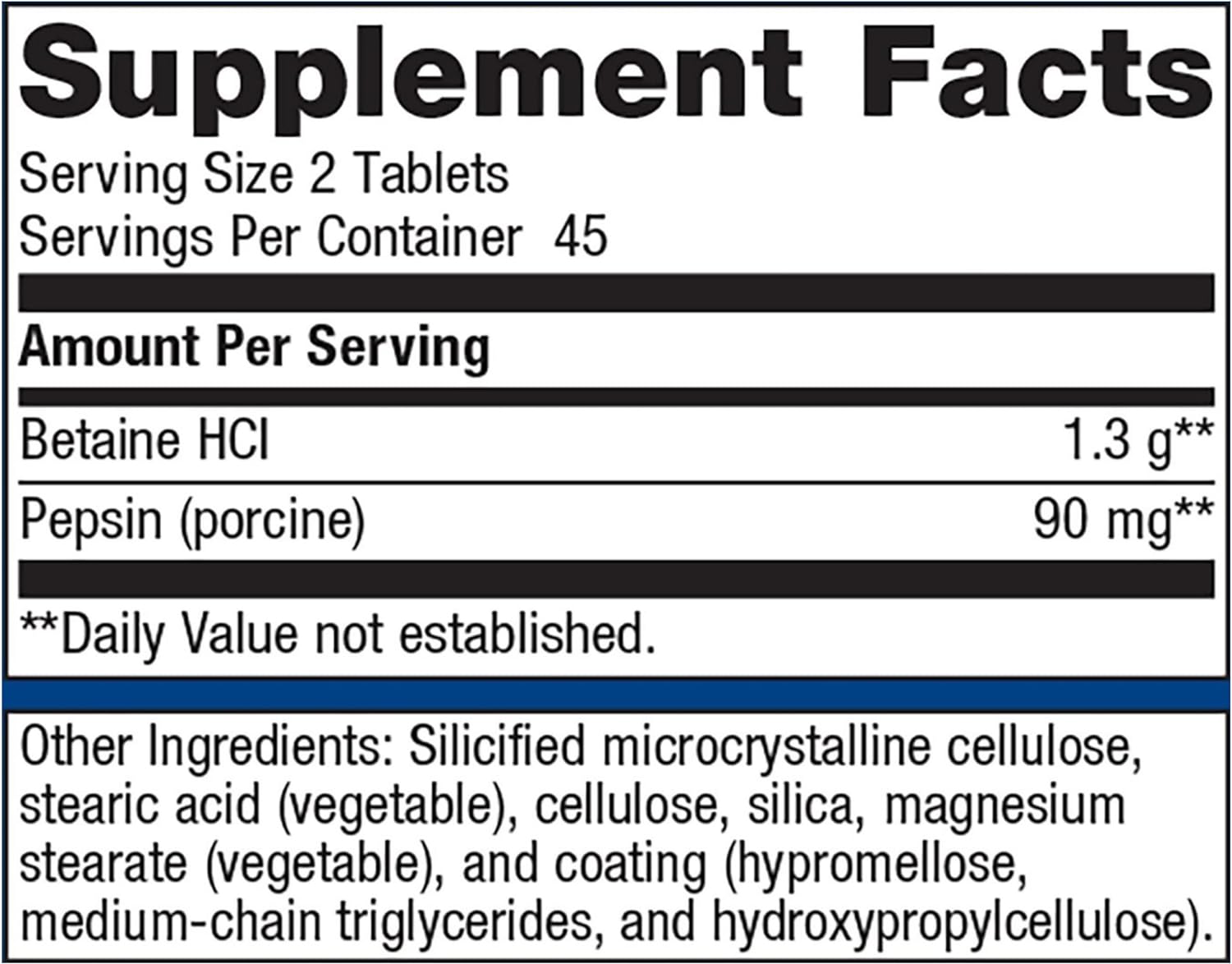 2 >Each 2-tablet dose features betaine HCl and pepsin, which help support the breakdown of food in the stomach