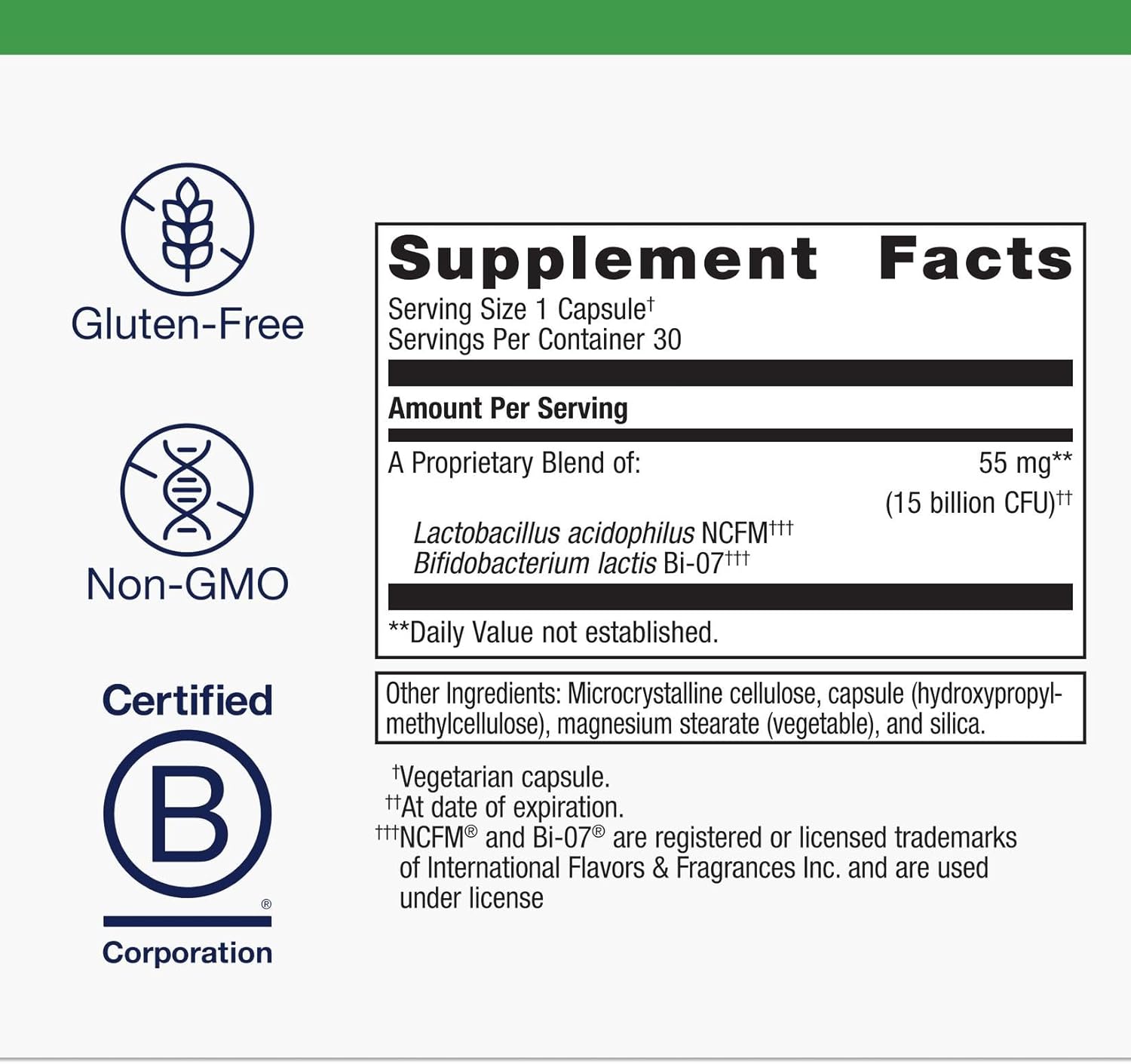 Daily Probiotic Support: This daily probiotic features B. lactis Bi-07 and L. acidophilus NCFM probiotic strains recognized by World Gastroenterology Organization
