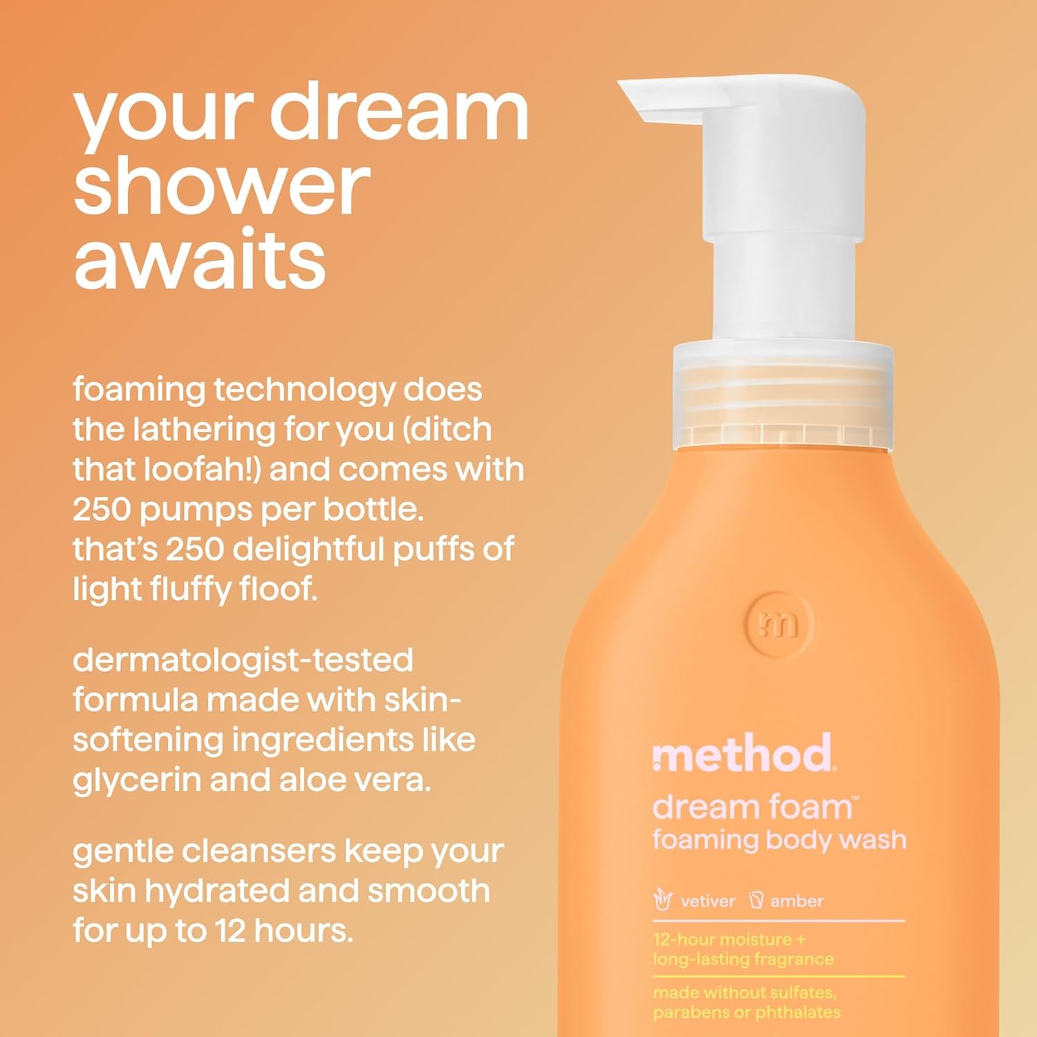 About this item moisturizing, foaming body wash: contains (1) 13.5oz bottle of dreamy, foaming body wash that nourishes your skin + your wildest dreams all day skin hydration: dermatologist-tested formula made with skin-softening ingredients like glycerin and aloe vera. gently cleans and keeps your skin hydrated and smooth for up to 12 hours shower in luxury: self-foaming technology does the lathering for you (ditch that loofah!) and comes with 250 pumps per bottle. that’s 250 delightful puffs of light fluffy floof as soft as a puppy's ears. long-lasting fragrance: smells like a soft and floral scent serenade, with notes of jasmine and sandalwood for good measure: made without sulfates, parabens, or phthalates. cruelty free. tested by people, not animals. bottle (minus pump) made with 80% recycled plastic (PCR). See more product details,moisturizing, foaming body wash: contains (1) 13.5oz bottle of dreamy, foaming body wash that nourishes your skin + your wildest dreams,all day skin hydration: dermatologist-tested formula made with skin-softening ingredients like glycerin and aloe vera. gently cleans and keeps your skin hydrated and smooth for up to 12 hours,shower in luxury: self-foaming technology does the lathering for you (ditch that loofah!) and comes with 250 pumps per bottle. that’s 250 delightful puffs of light fluffy floof as soft as a puppy's ears,long-lasting fragrance: smells like a soft and floral scent serenade, with notes of jasmine and sandalwood,for good measure: made without sulfates, parabens, or phthalates. cruelty free. tested by people, not animals. bottle (minus pump) made with 80% recycled plastic (PCR)