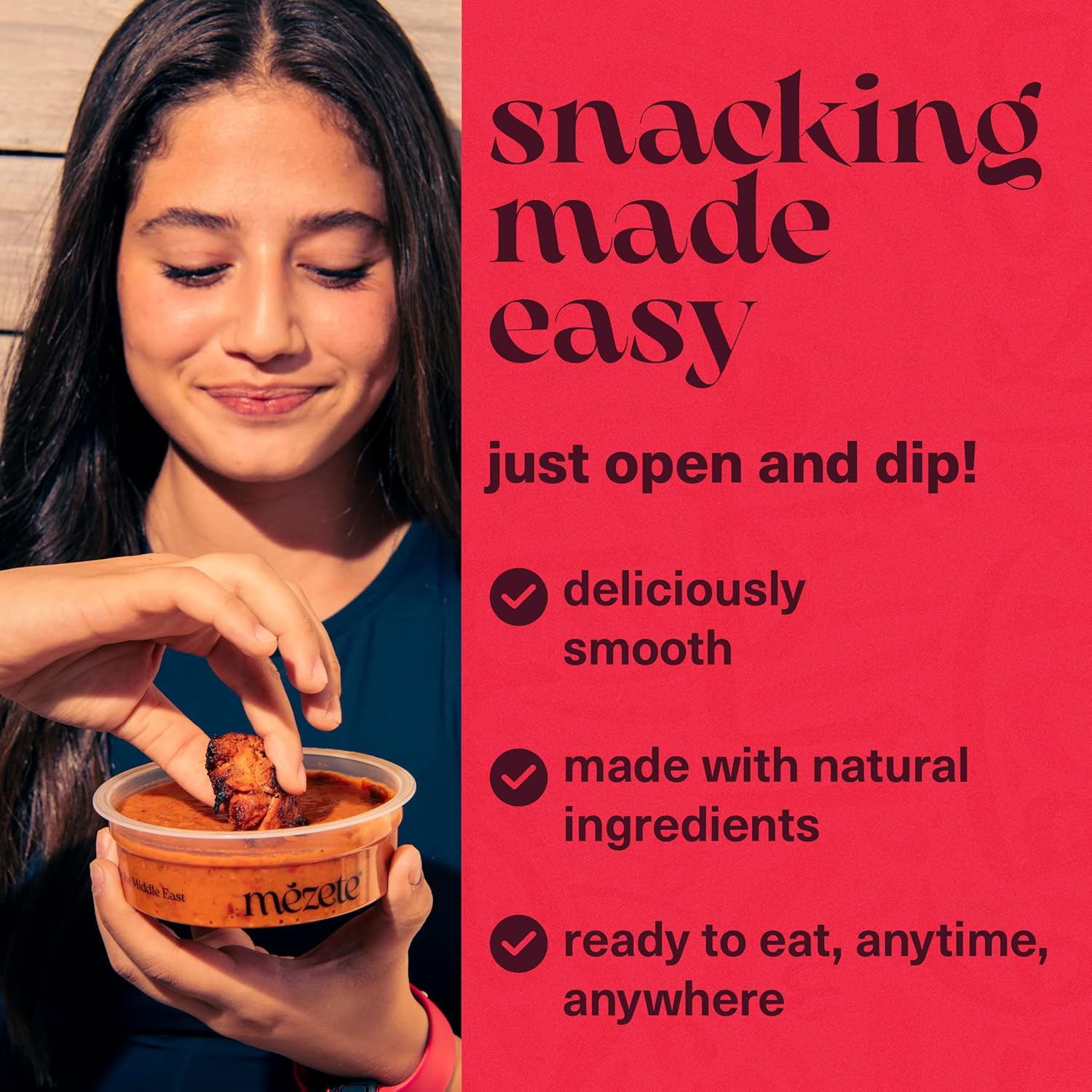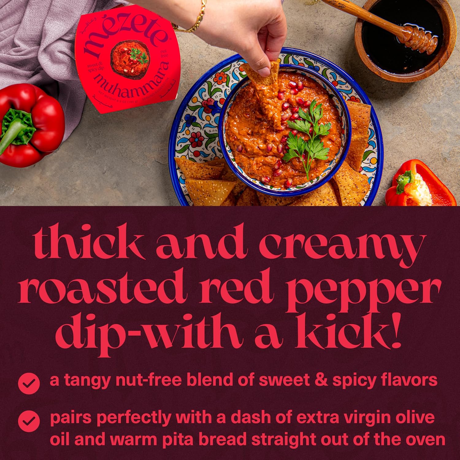 About this item AUTHENTIC MIDDLE EASTERN - Mezete Muhammara is crafted with a dedication to the traditional recipe, bringing the genuine taste of Middle Eastern culture to your table. Perfect for those seeking a dip that honors classic culinary heritage. NOTHING ARTIFICIAL - Mezete gourmet dips are crafted from real ingredients with no preservatives, additives, or added oils. Enjoy the pure, authentic taste in every bite! SHELF-STABLE – Thanks to years of research, Mezete dips have an extended shelf life without the need for preservatives. Enjoy your favorite dip whenever you want, with no rush—our dips stay fresh longer than other brands, so you can savor every bite! NUT-FREE - This vegan dip is safe for those with nut allergies, allowing everyone to enjoy the authentic flavors of the Middle East. SWEET & SPICY - Enjoy the perfect balance of heat and sweetness in every bite. Our dip blends the warmth of roasted red peppers with the sweetness of pomegranate molasses, creating a rich, unforgettable flavor. A VERSATILE CONDIMENT - Perfect as a spread, a dip for chips, or paired with extra virgin olive oil and warm pita or charcuterie. This dip complements any snack or meal beautifully. See more product details,AUTHENTIC MIDDLE EASTERN - Mezete Muhammara is crafted with a dedication to the traditional recipe, bringing the genuine taste of Middle Eastern culture to your table. Perfect for those seeking a dip that honors classic culinary heritage,NOTHING ARTIFICIAL - Mezete gourmet dips are crafted from real ingredients with no preservatives, additives, or added oils. Enjoy the pure, authentic taste in every bite!,SHELF-STABLE – Thanks to years of research, Mezete dips have an extended shelf life without the need for preservatives. Enjoy your favorite dip whenever you want, with no rush—our dips stay fresh longer than other brands, so you can savor every bite!,NUT-FREE - This vegan dip is safe for those with nut allergies, allowing everyone to enjoy the authentic flavors of the Middle East,SWEET & SPICY - Enjoy the perfect balance of heat and sweetness in every bite. Our dip blends the warmth of roasted red peppers with the sweetness of pomegranate molasses, creating a rich, unforgettable flavor,A VERSATILE CONDIMENT - Perfect as a spread, a dip for chips, or paired with extra virgin olive oil and warm pita or charcuterie. This dip complements any snack or meal beautifully