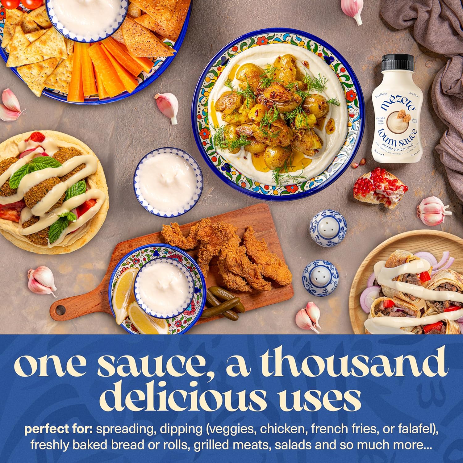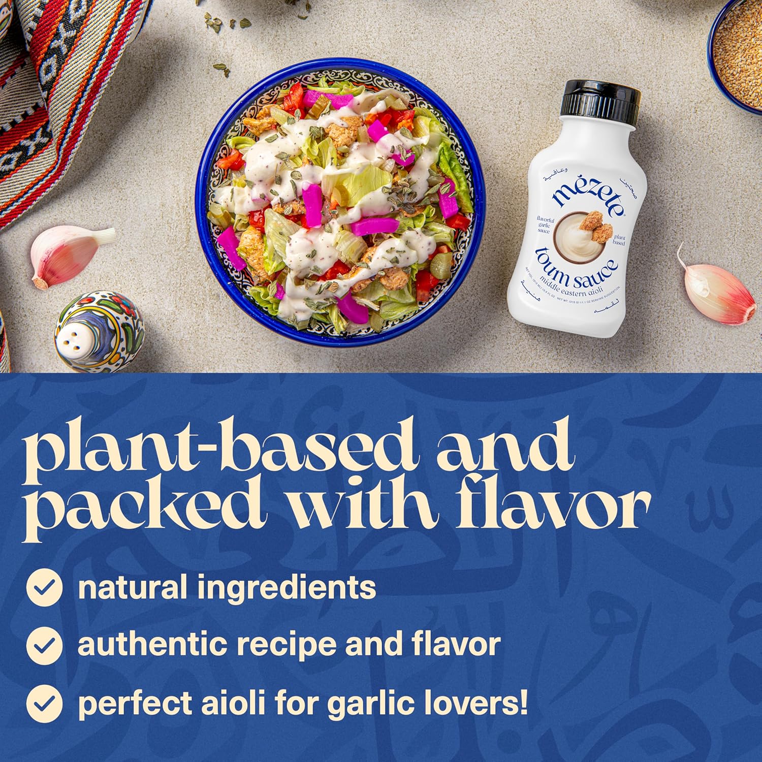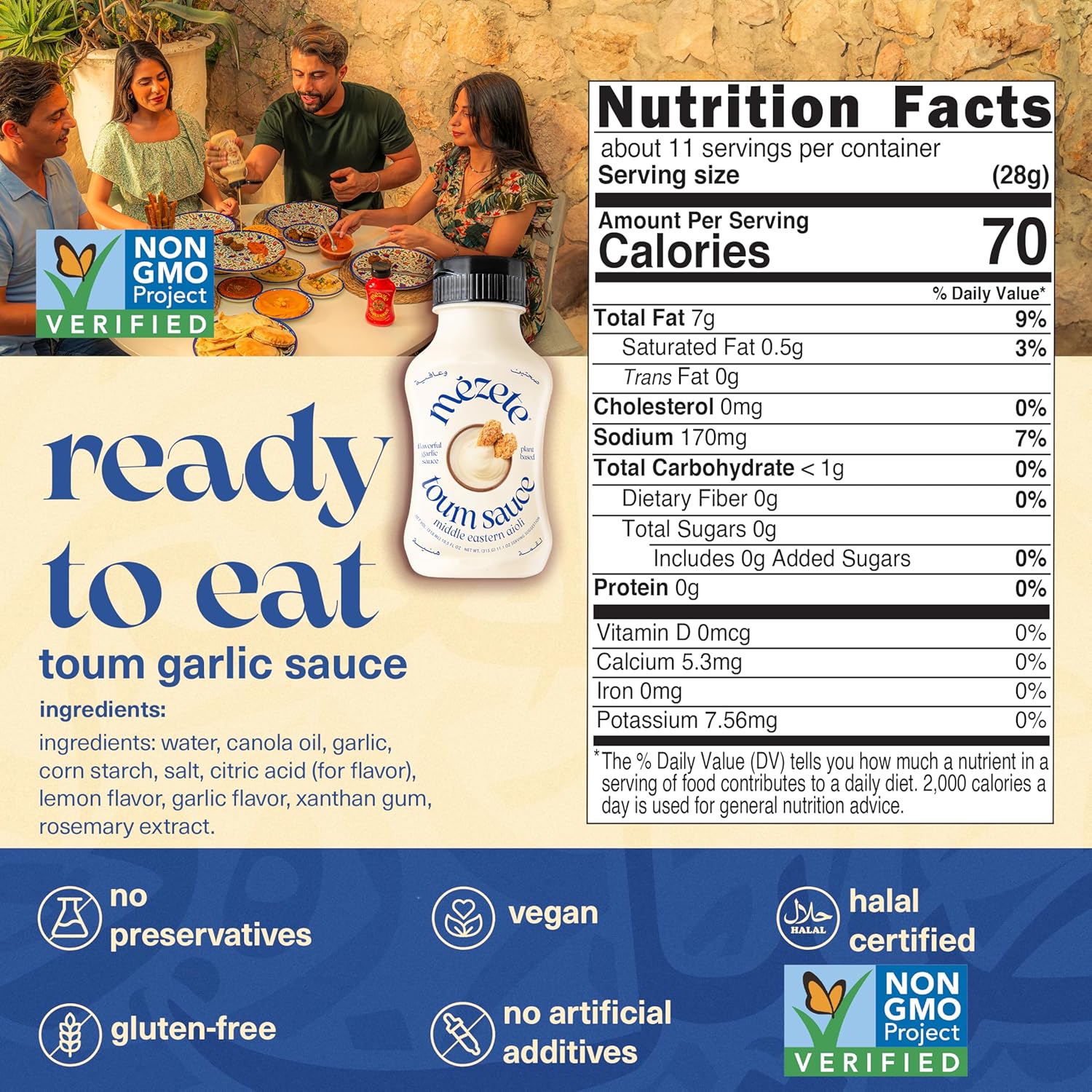 About this item NOTHING ARTIFICIAL - Our ingredient list is simple with nothing unnatural, no preservatives, no additives & no added oils. Taste the real flavors with our rich & creamy garlic dipping sauce. AUTHENTIC MIDDLE EASTERN - Made with premium, carefully sourced ingredients, Mezete Toum follows the traditional recipe capturing the true essence of Middle Eastern cuisine. SHLEF STABLE GARLIC SPREAD - Mezete sauces are crafted to stay fresh. No refrigeration is needed before opening, making it easy to store in your pantry and ready to use whenever you crave that creamy goodness. BOLD & ZESTY FLAVOR β Mezete Toum delivers a burst of bold garlic flavor with a light, airy texture. This creamy mayo like sauce has a bright, tangy taste with just the right amount of garlic kick, balanced by a subtle hint of lemon. A delicious way to add depth and zest to any dish. MESS-FREE SQUEEZE - Pop it open and squeeze the fun out without any mess. Our garlic squeeze bottle is convenient to carry and easy to use. βΊ See more product details,NOTHING ARTIFICIAL - Our ingredient list is simple with nothing unnatural, no preservatives, no additives & no added oils. Taste the real flavors with our rich & creamy garlic dipping sauce,AUTHENTIC MIDDLE EASTERN - Made with premium, carefully sourced ingredients, Mezete Toum follows the traditional recipe capturing the true essence of Middle Eastern cuisine,SHLEF STABLE GARLIC SPREAD - Mezete sauces are crafted to stay fresh. No refrigeration is needed before opening, making it easy to store in your pantry and ready to use whenever you crave that creamy goodness,BOLD & ZESTY FLAVOR β Mezete Toum delivers a burst of bold garlic flavor with a light, airy texture. This creamy mayo like sauce has a bright, tangy taste with just the right amount of garlic kick, balanced by a subtle hint of lemon. A delicious way to add depth and zest to any dish,MESS-FREE SQUEEZE - Pop it open and squeeze the fun out without any mess. Our garlic squeeze bottle is convenient to carry and easy to use